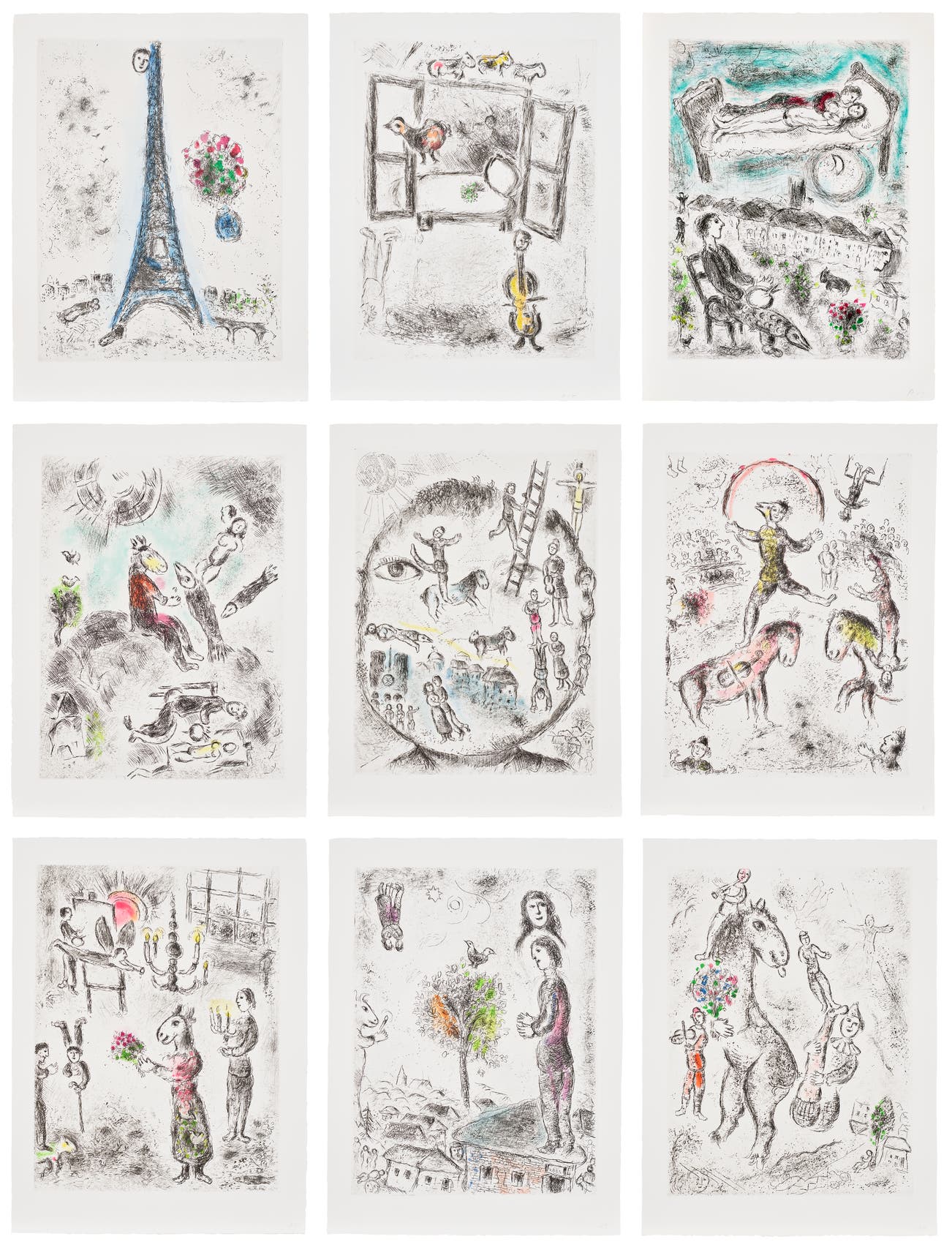 全套25組蝕刻版畫 幼點腐蝕 BFK Rives紙本附「ME」水印(四周留邊,散裝及折疊如出版所示)附有路易斯阿拉貢撰寫的文字、標題頁和版權頁,全部包含在原始紙質包裝和米色布面翻蓋盒中,盒上刻有金色浮雕藝術家和作者的名字。