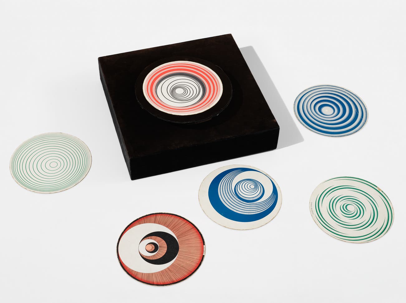 完整的限量版作品包含12幅彩色膠版石印畫,印製於六張圓形硬紙板圓盤的兩面(旨在以每分鐘33 1/3轉的速度旋轉時進行觀賞);作品還附帶黑色塑料圓形圓盤支架,以及一台表面覆有黑色天鵝絨的電動壁掛式展示裝置——該單元內置原裝面板與低鐵相間的尺寸搭配磁飾