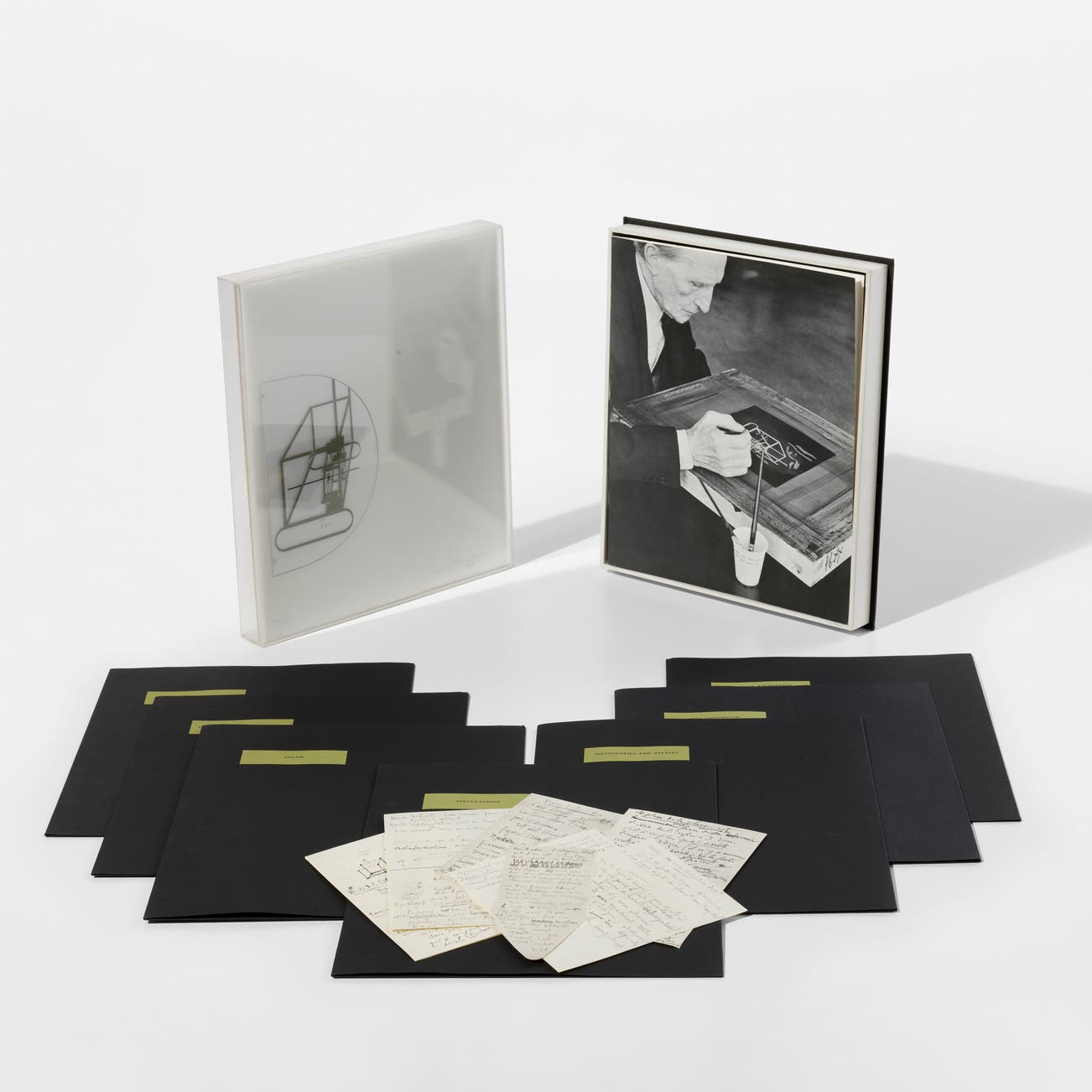 本套作品包含一幅黑、橄欖雙色網版畫(印於乙烯基材質並按原樣裝裱於有機玻璃之上),以及78份筆記的複製件;筆記複製件分裝於七個黑色紙質文件夾內,整體收納於原裝亞麻布面作品集盒中,盒面印有標題;現缺一份筆記複製件。