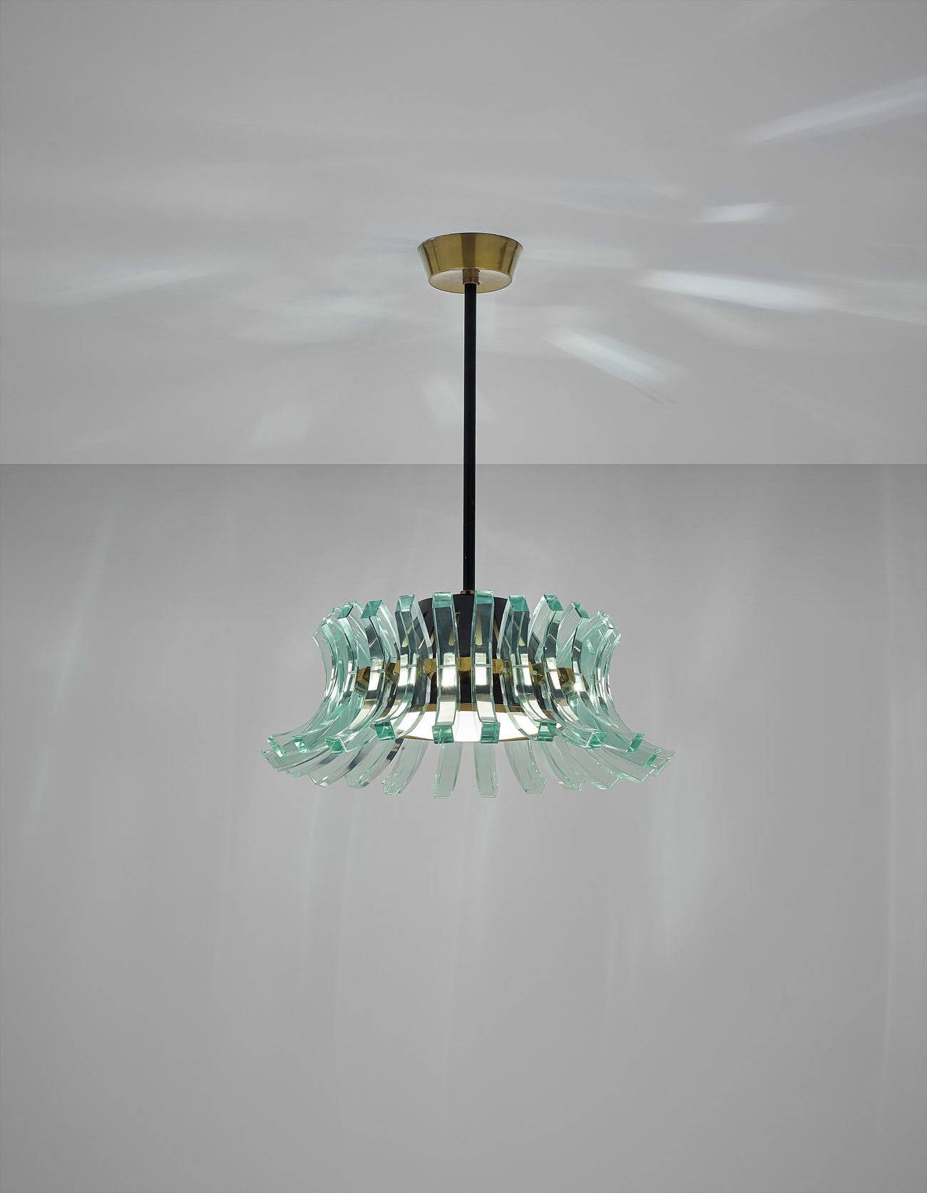 本件拍品意圖將傳統吊燈現代化,呈現透明成型玻璃片環繞在中心不透明的玻璃燈源周圍,營造出光暈發散的效果。英格蘭重視玻璃製品專業的手工藝技巧同時,也著重融入工業原料,例如塗裝管狀鋼,并完美地結合傳統與現代。在設計師皮耶·埃曼紐爾·馬丁·維維爾的設計師專著中,他曾提到英格蘭的燈具「超越了一般功能用途而成為不受時間、時尚限制的代表性傑作」。此外,透過他利用媒材的方式,例如在「天竺牡丹」系列作品 (參閱拍品編號53) 中採用彩色玻璃作為花瓣,英格蘭證明了人工燈具可以如同自然光線一般光輝璀璨。