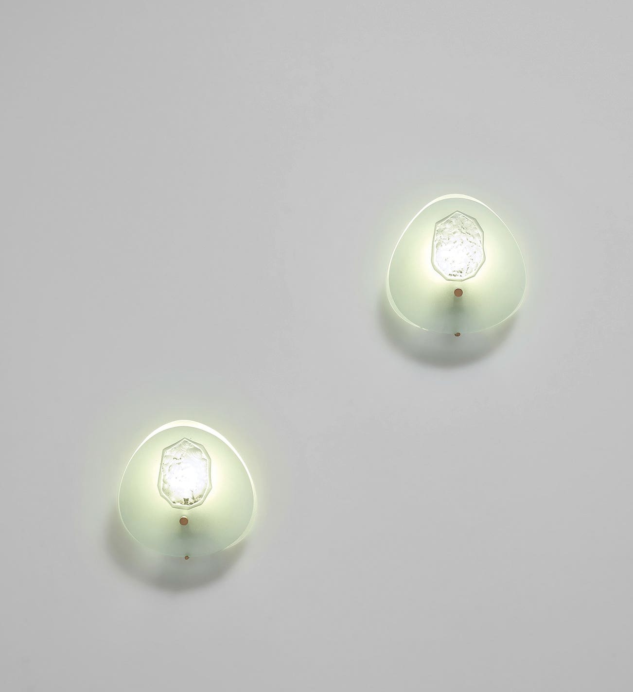Partially chiselled and acid-etched glass, brass, painted brass.