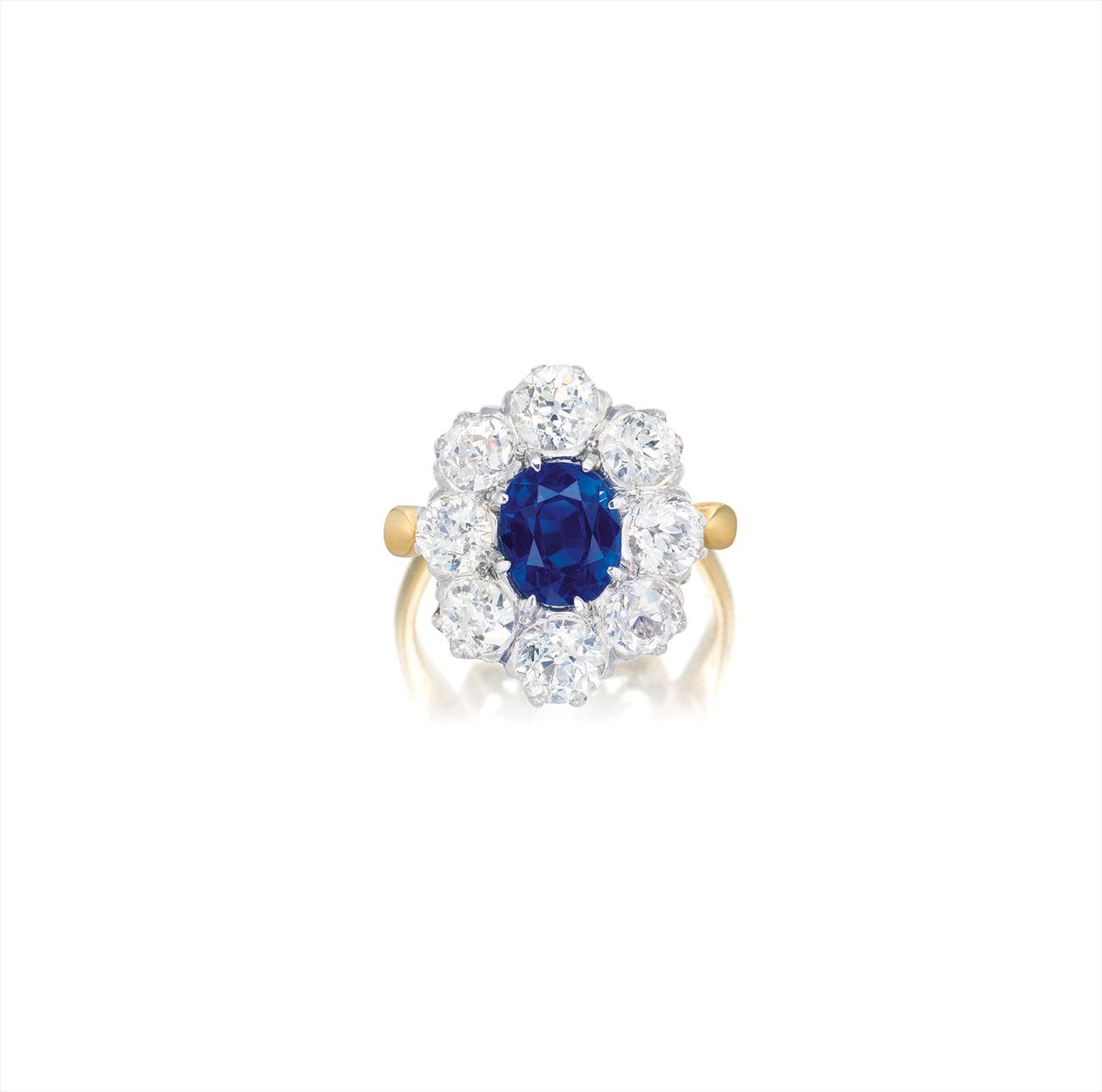 One oval-shaped sapphire, 2.19 caratsOld-cut diamonds in the surround, totalling approximately 2.40 caratsPlatinum and 18 karat yellow goldFrench export marks附 AGL 及 SSEF 證書