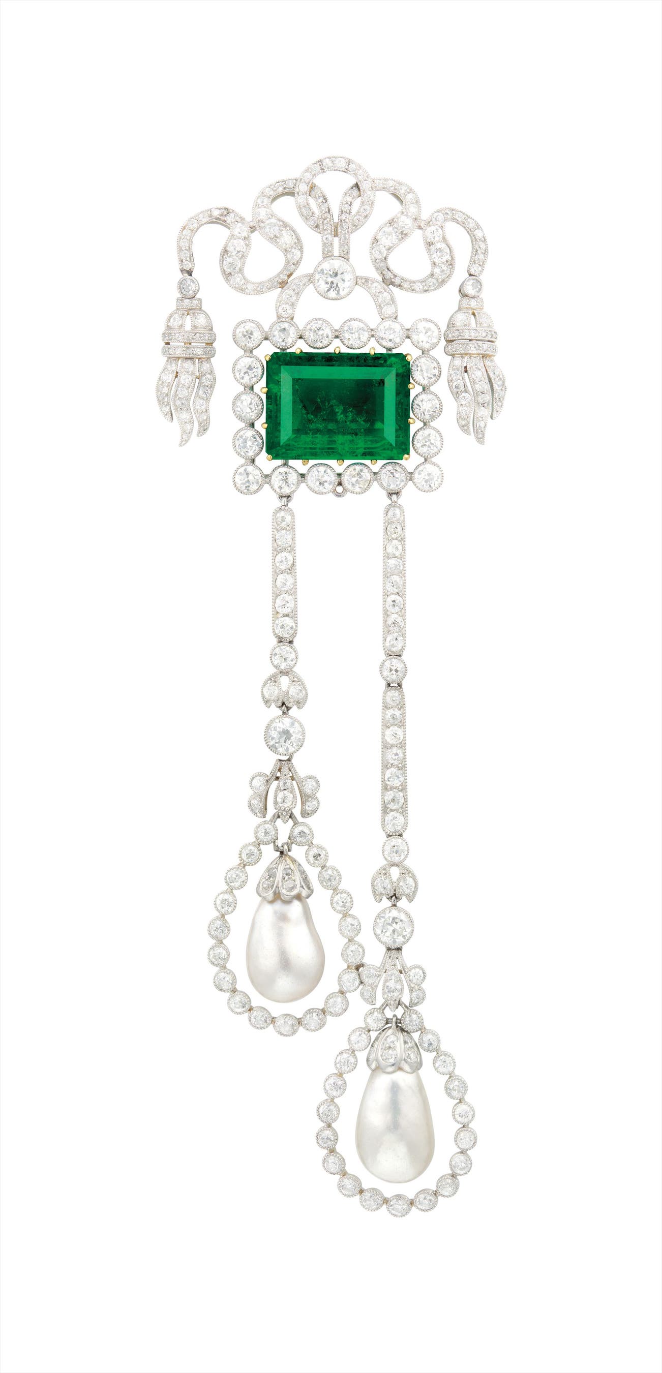 相比起維多利亞時代盛極一時的大胸針(或稱作Stomacher)設 計,「美好時代」的作品絕對毫不遜色,而且種類更多變,但因為服裝的用料相對柔軟輕薄,所以別針必須更輕巧。此外,為了表現出飾物的柔美動感,很多設計都會垂吊鑽石或天然珍珠流蘇和墜子,讓珠寶跟隨佩戴者的步伐徐徐搖動,優美動人。是次拍賣為大家呈獻這件已有超過一百年歷史的祖母綠配鑽石及天然珍珠別針,無疑是「美好時代」作品的絕佳例子。這枚別針(拍品636)不但鑲在兩顆相配匹的水滴形天然珍珠,其設計成彩帶的上方還鑲有一顆重16.72克拉的天然哥倫比亞袓母綠。這顆出自南美著名產區的袓母綠除了份量驚人以外,最重要是它完全沒有經過淨度的加工處理,就是業內所指的「浸油」。袓母綠「浸油」加工其實在珠寶界已被視為常規的做法,所以現今市場上絕大部份的哥倫比亞祖母綠都有不同程度的加工處理。這顆全天然、沒有經過任何淨度加工的祖母綠本身已經是世上稀有的寶物,再加上擁有逾一百年歷史的古董別針部份,稀珍之處昭然可見。此別針雖然已有一定的年份,但佩戴時只要稍花心思,便可以將其轉換成項鏈的吊墜,或別在髮髻上作為獨一無二的髮飾,用法多變。
