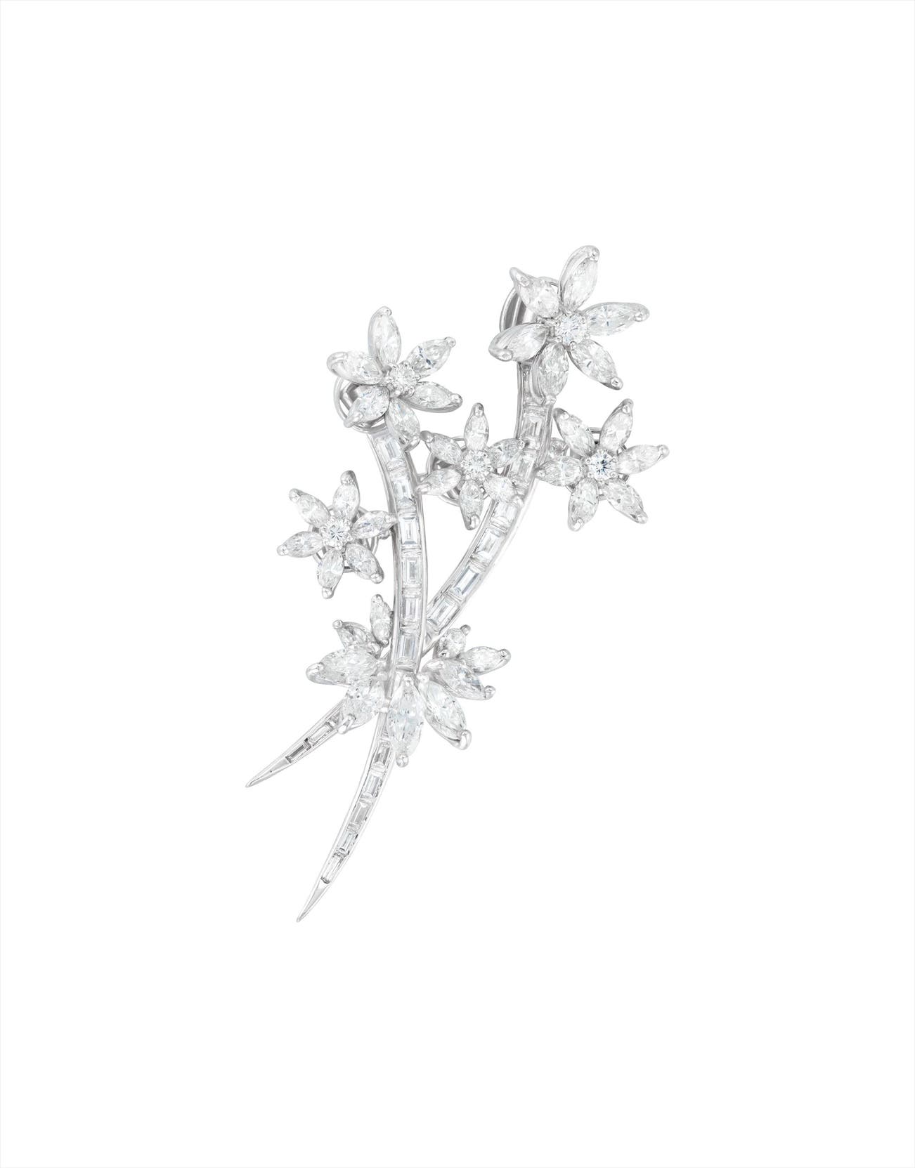 此別針採用了名為en tremblant的鑲嵌工法,en tremblant二字來自法語,意思是珠寶有部分組件能「顫抖」。此工法尤其多見於別針設計,最早於十八世紀由巴黎的工匠發明,所以在十八及十九世紀的珠寶上十分常見。工匠會將細小的金屬線扭成彈簧,於其上方鑲嵌鑽石或寶石的組件,那佩戴起來這些組件在便會輕微抖動,令寶石閃閃發亮,更為生動。在en tremblant的珠寶中,以花的設計最受歡迎,它們大部分都鑲有會抖動的花蕊,此拍品便是很好的例子。