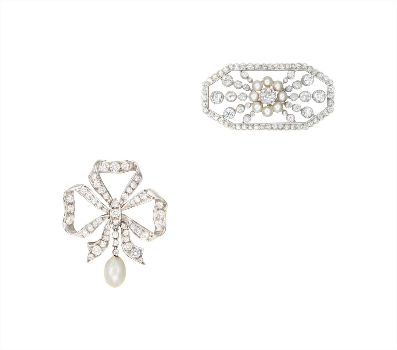 (Open-work Brooch) Eight seed pearlsDiamonds, totalling approximately 1.40 carats and 1.90 carats respectivelyPlatinum and Silver-topped gold附 法國寶石 證書