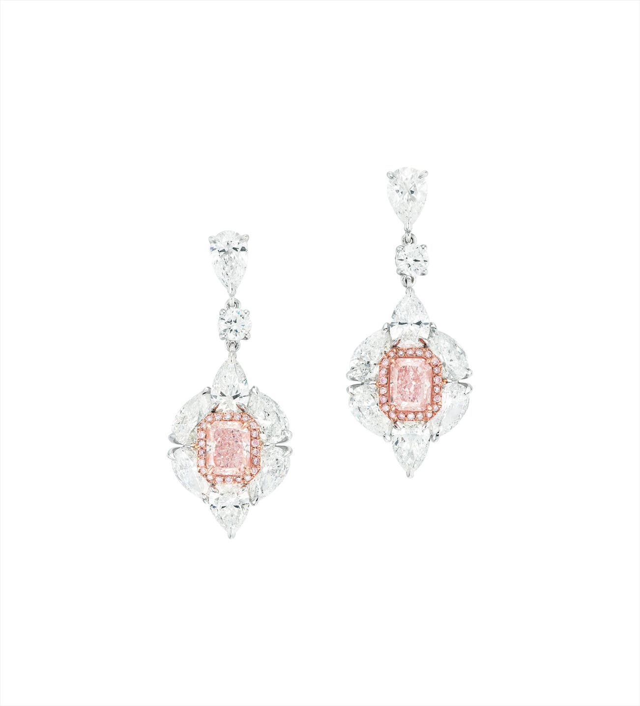 Two cut-cornered rectangular Fancy Purplish Pink Diamond and Fancy Pink Diamond, 1.10 and 1.04 caratsDiamonds and pink diamonds in the surrounds, totalling approximately 8.70 carats18 karat white and pink gold附 GIA 證書