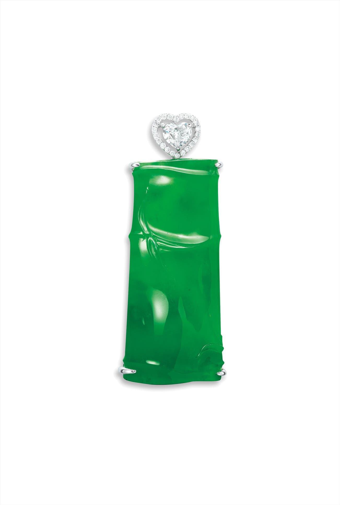 One carved jadeite 'bamboo', <em>measuring approximately 39.67 x 18.15 x 7.05mm </em>Diamonds on side18 karat white gold(Jadeite 'Bamboo') <em>Hong Kong Jade & Stone Laboratory report numbered KJ93902, dated 4 October 2016, Type A jadeite, natural colour without any resin. </em>