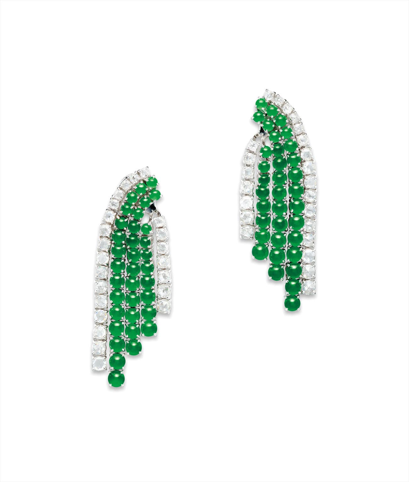 這對耳環設計別樹一格,「前後」鑲嵌將部分的翡翠流蘇連在耳針的位置,讓佩戴起來的時候更有動感,也讓其他人可以從多角度來欣賞這一個動人的作品。