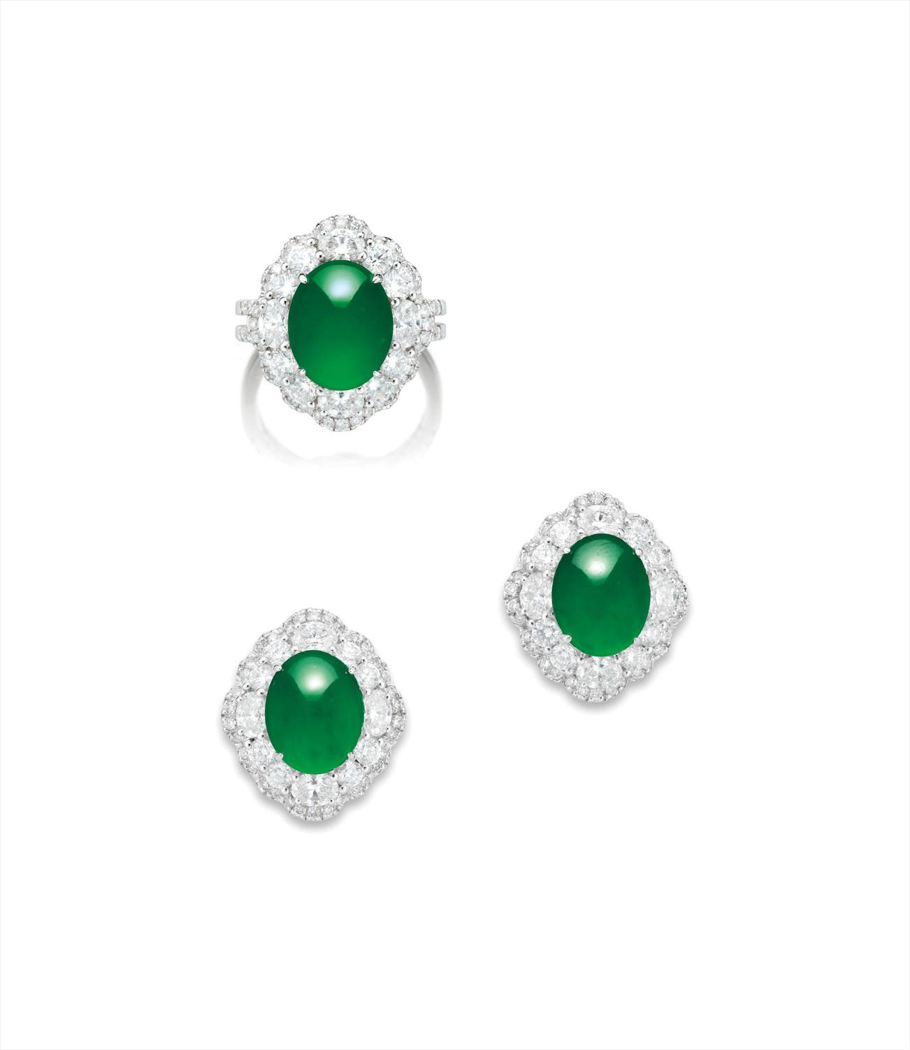 (Earrings) Two jadeite cabochons, <em>measuring approximately 11.57 x 9.32 x 3.95mm and 11.59 x 9.36 x 3.32mm</em>Diamonds in the surrounds, altogether approximately 4.45 carats18 karat white gold附 香港玉石鑑定中心 證書