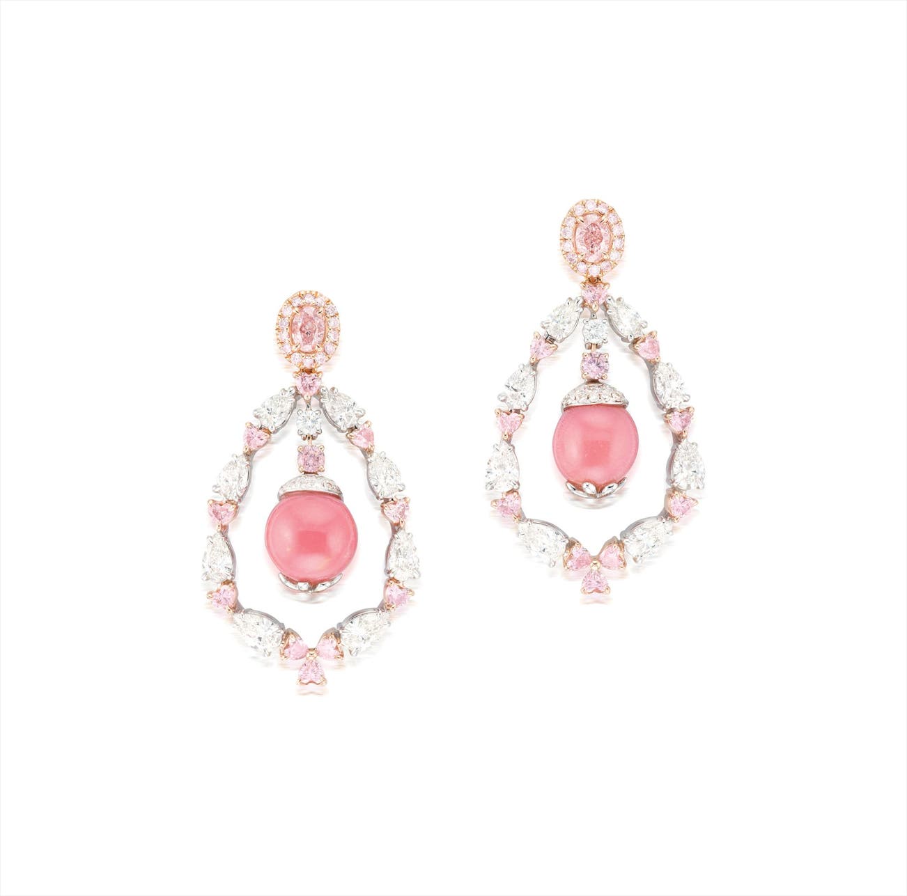 Two conch pearls, measuring approximately 8.76 x 8.99 x 8.51mm and 8.60 x 8.75 x 7.65mm, totalling 10.53 caratsPink diamonds and diamonds in the surmounts, totalling approximately 5.00 carats18 karat pink and white gold附 SSEF 證書