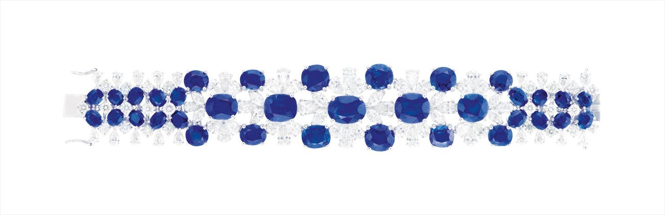藍寶石色澤美艷、硬度極高,是權力和財富的象徵,亦是代表皇室貴族的寶石。儘管緬甸的抹谷礦區以所產的紅寶石聞名於世,但其實同一個礦區也是世上一些最頂級藍寶的產地。 近代的緬甸藍寶礦源相對產量極少,而超過十卡拉又能達到寶石級的藍寶在現今市場上更是寥寥可數。事實上,緬甸的礦產只佔全球紅寶和藍寶產量的10%,而 當中只有少於1%屬於寶石級。緬甸藍寶的特點在於顏色的厚度夠深,淨度清脆明亮,因此閃光特別的耀眼。此拍品尤其出衆,手鏈上鑲有 35 顆匹配的優質緬甸藍寶石,飽和艷麗的藍色游走於美鑽的閃爍之間,綻放都會華美。