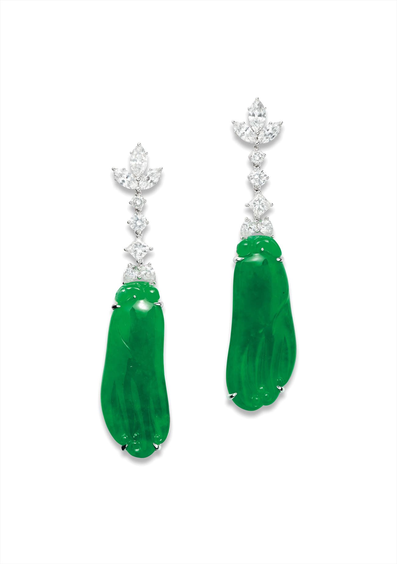 Two carved jadeite 'Buddha's hand', <em>measuring approximately 36.27 x 14.27 x 4.50mm and 36.20 x 14.42 x 4.45mm</em>Diamonds in the surmounts, totalling approximately 3.75 carats18 karat white gold附 香港玉石鑑定中心 證書