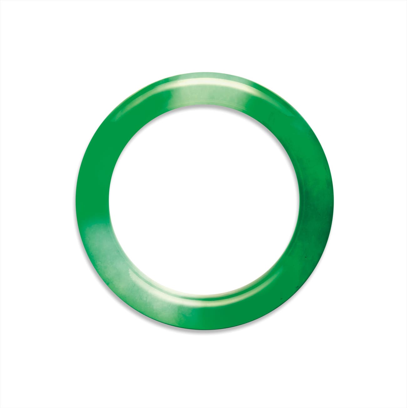 手鐲可謂翡翠首飾中最有特色、最為傳統的造型; 事實上,早於四千多年前,軟玉就已經被切割成戴在手的環形飾品。要把一塊原石切割成手鐲,不但是極為耗料的做法,而且原石不能有任何裂紋和內部的結構問題,所以要從單一塊原石切割出翡翠手鐲絕非易事,這也說明了為何藏家對追捧天然翡翡手鐲甚為殷切。此拍品就是翡翠手鐲中的上乘佳品,不但質地透亮,而且帶有翡翠中最珍貴的「帝皇綠」色。