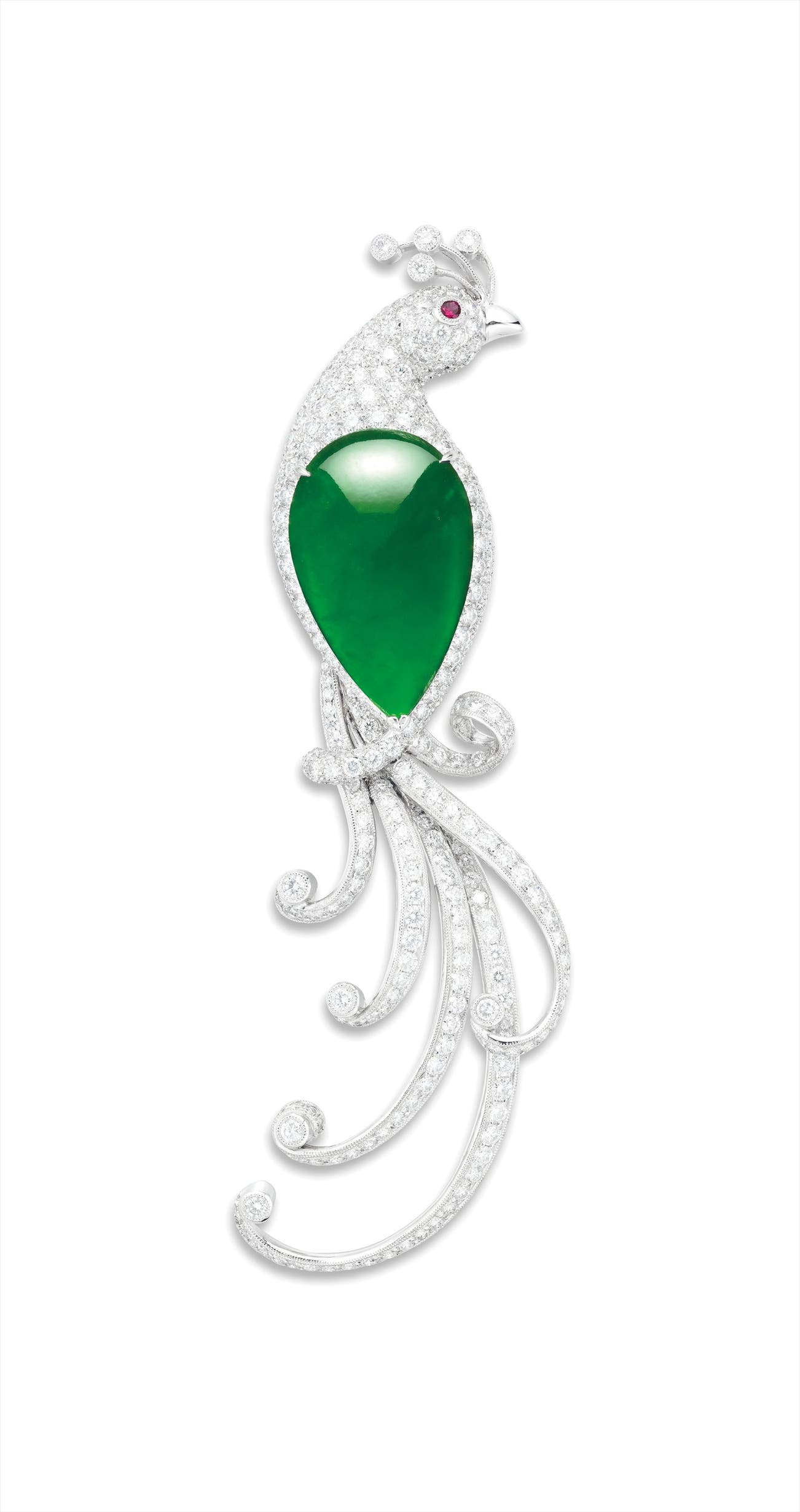 One pear-shaped jadeite cabochon, <em>measuring approximately 25.70 x 16.36 x3.79mm </em>Diamonds in the surround, totalling approximately 4.00 carats18 karat white gold附 香港玉石鑑定中心 證書