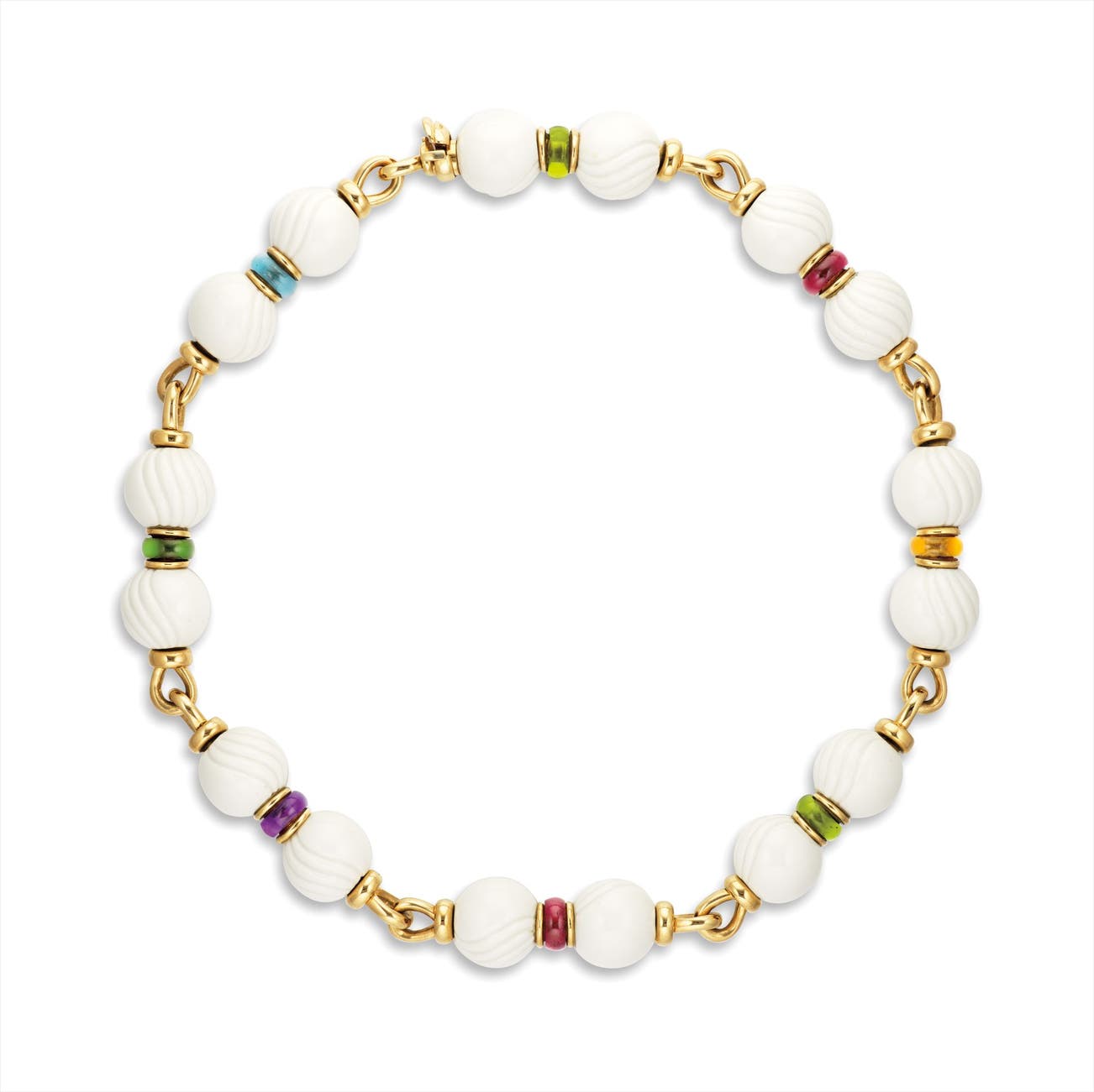 Amethyst, blue topaz, citrine, peridot, pink and green tourmaline roundelsFluted white porcelain beadsItalian assay markWith signed box