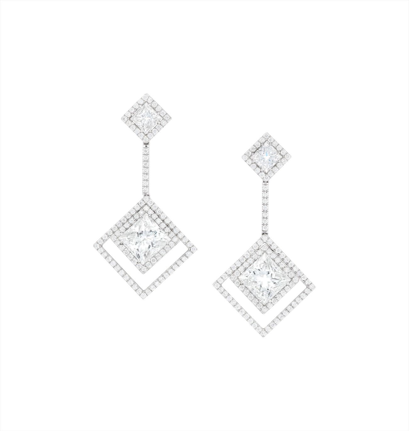 Two square modified brilliant-cut diamonds, 3.02 and 3.01 caratsTwo square modified brilliant-cut diamonds in the surmounts, 0.71 and 0.70 carat