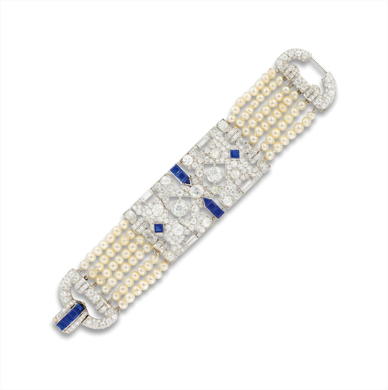 天然珍珠配鑽石及藍寶石項鏈,年份約1915