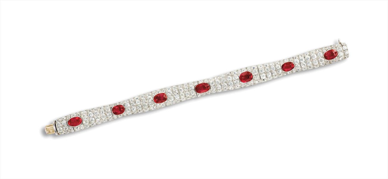 Seven oval-shaped rubies, totalling approximately 8.00 caratsOld-cut diamonds on side, totaling approximately 6.50 carats18 karat white and yellow gold附 SSEF 證書