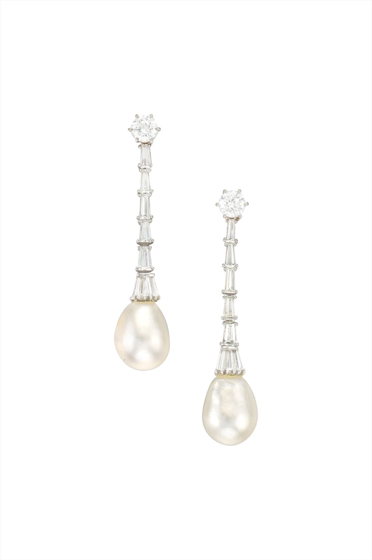 Two natural pearls, measuring approximately 12.20 x 10.10 x 9.10mm and 12.40 x 10.10 x 9.70mmDiamonds in the surmounts, totalling approximately 1.80 caratsPlatinum附 SSEF 證書