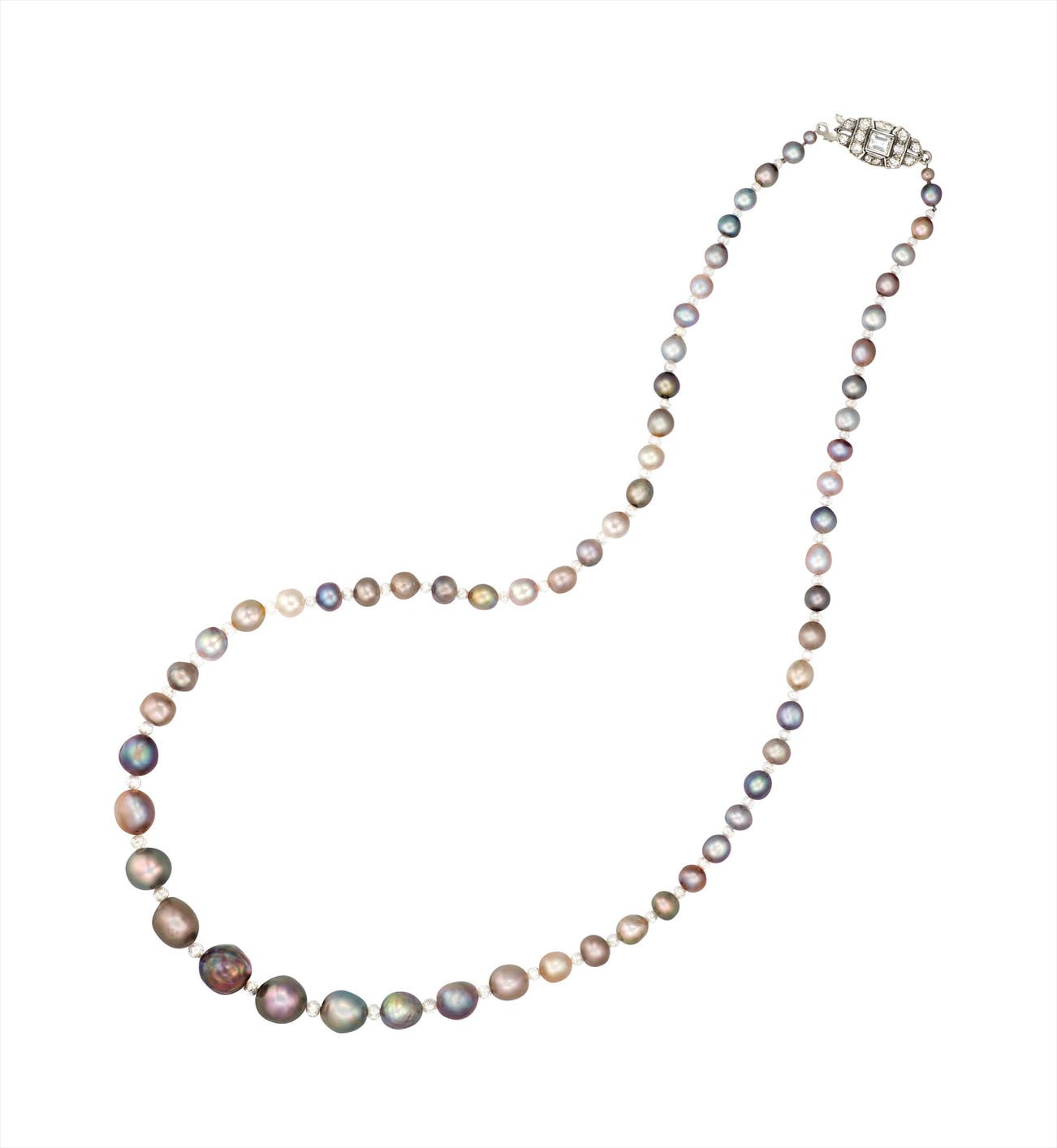 Sixty-three natural saltwater pearls, measuring approximately 9.10 to 2.40mmDiamond beads, totalling approximately 5.70 carats18 karat white gold附 英國寶石 證書