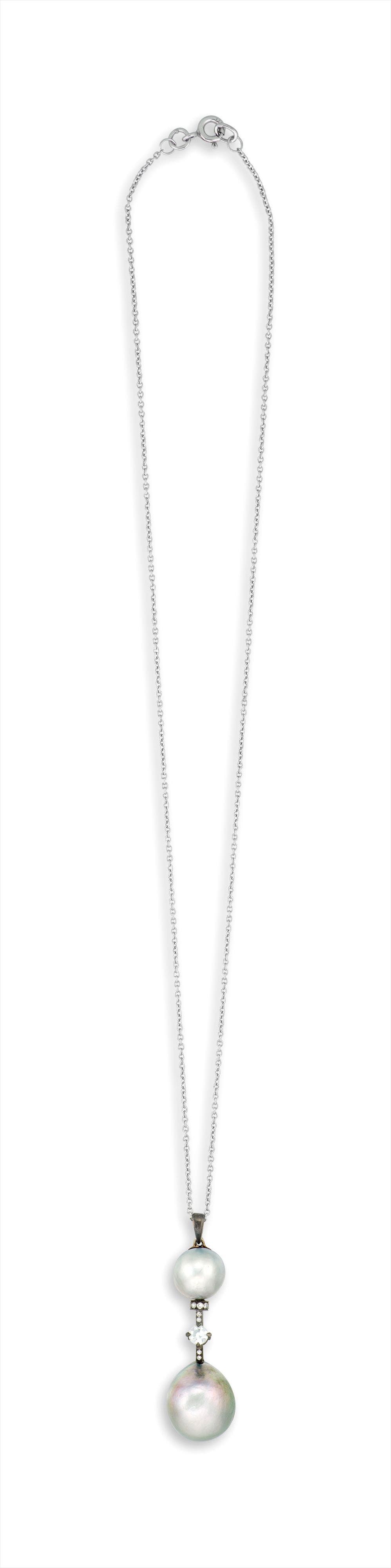 Two semi-baroque natural pearls, measuring approximately 13.90 x 12.20 x 9.80mm and 9.30 x 9.10 x 8.00mmSingle-cut diamonds on side<em>With a platinum chain, length approximately 400mm </em>附 英國寶石 證書