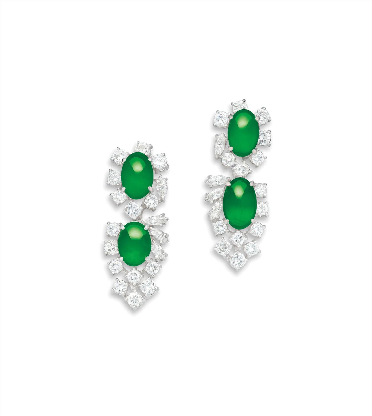 Four jadeite cabochons, <em>measuring approximately 9.07 x 6.79 x 2.93mm to 9.80 x 6.30 x 2.75mm </em>Diamonds on side, totalling approximately 2.50 carats18 karat white gold附 香港玉石鑑定中心 證書