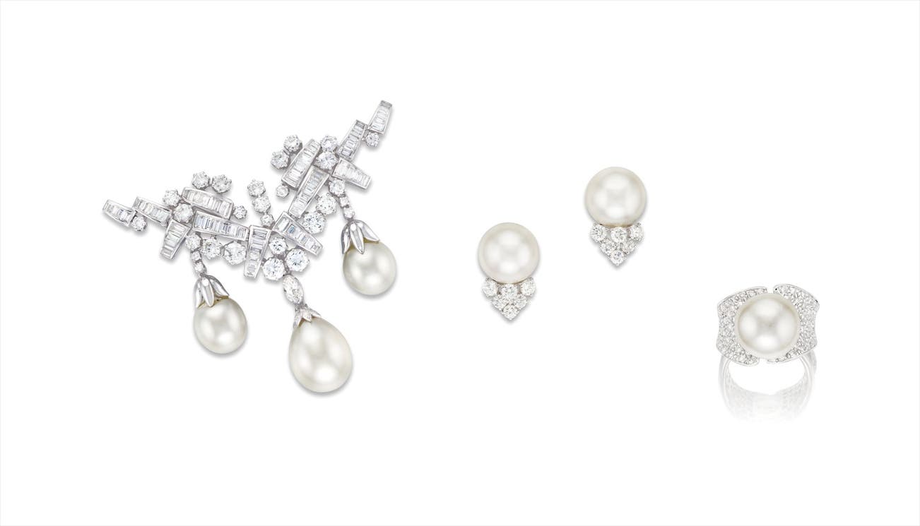 養殖珍珠配鑽石戒指、耳環及別針套裝 (3)