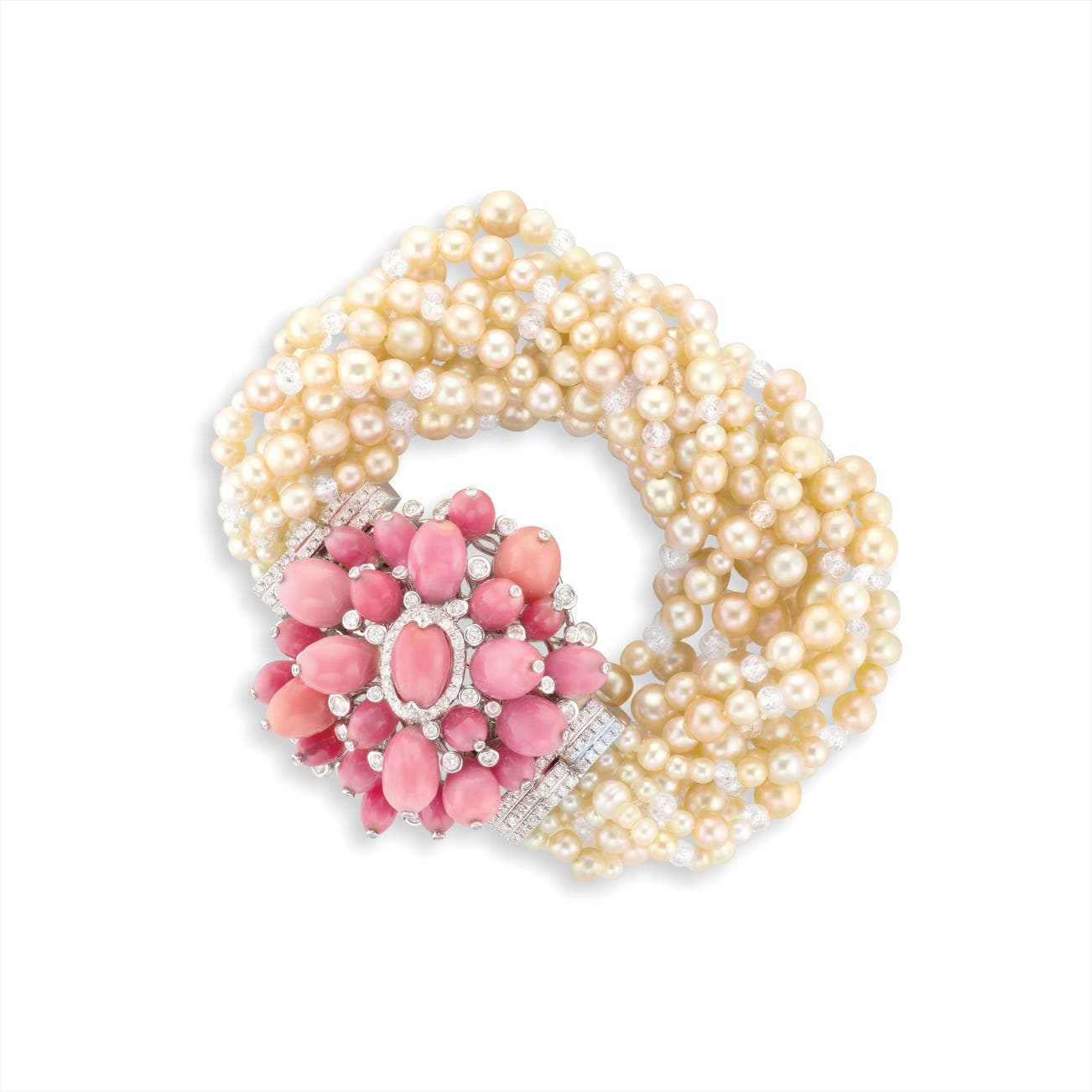 海螺珍珠屬於天然珍珠的一種,不含文石礦物,產自一種出現在印度洋和太平洋的巨型海蝸牛,其表面光澤經常被比作瓷。天然海螺珠十分稀珍,當中以粉紅色和橙色的海螺珠最受歡迎,如果其表面出現「火焰」般的紋和圖案,價值就更加高。這件拍品以天然海螺珠和天然珍珠配搭而成,其中有許多海螺珠都有罕見的「火焰」紋,顏色由濃紫粉紅色到粉紅色,嬌美動人。這條手鏈無論是在設計、功能或是用料方面,都是十分稀珍的一件珠寶首飾。
