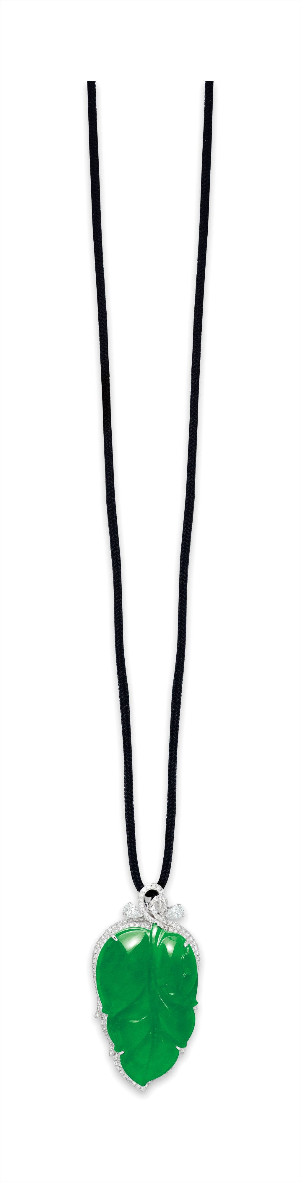 One carved jadeite 'leaf', <em>measuring approximately 40.26 x 25.07 x 5.62mm</em>Diamonds on side, totalling approximately 2.00 carats18 karat white gold附 香港玉石鑑定中心 證書