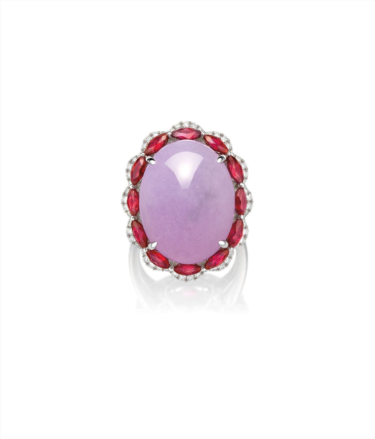 天然紫翡翠蛋面配紅寶石及鑽石戒指