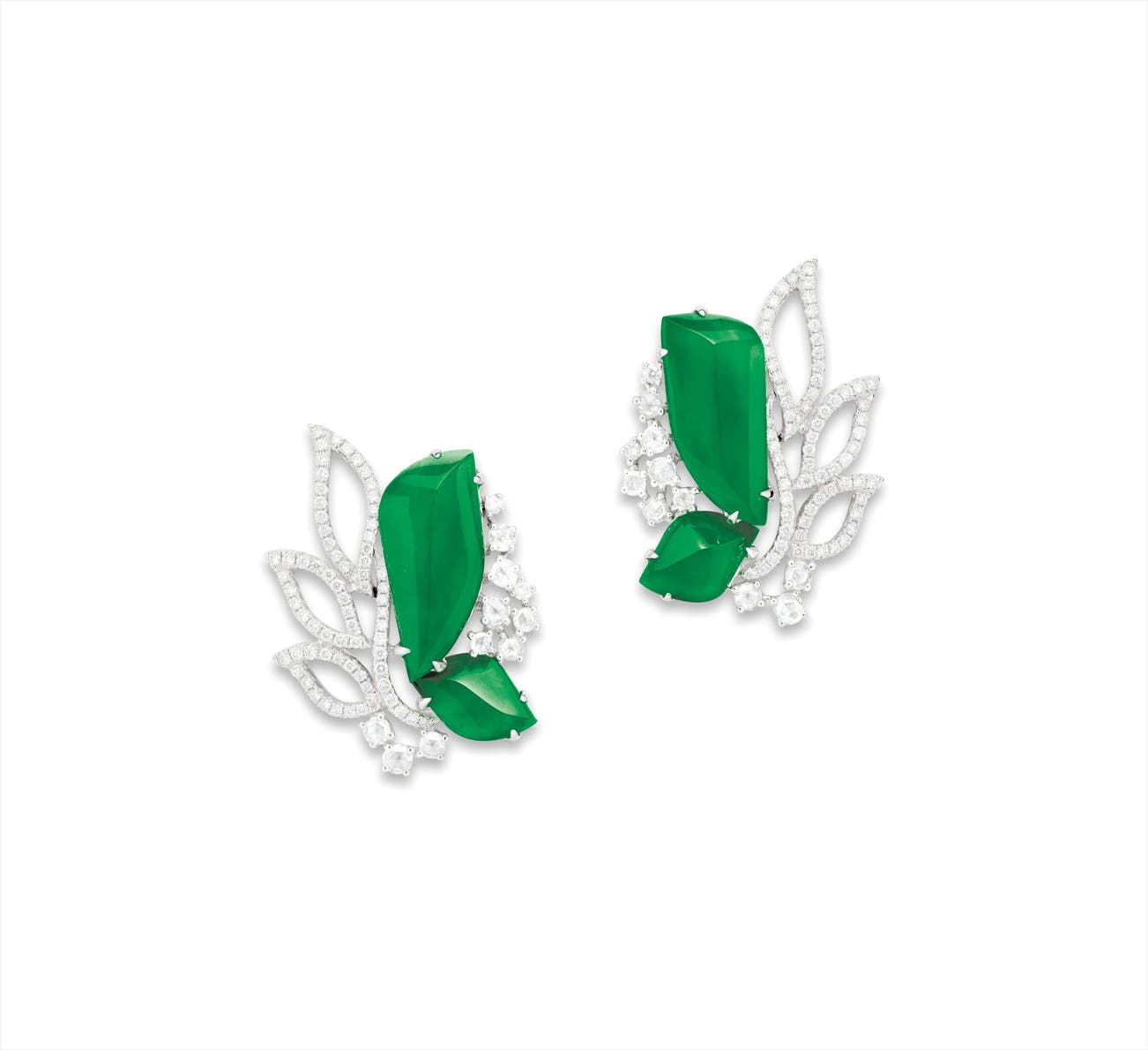 Four jadeites, <em>measuring approximately 18.09 x 8.02 x 2.99mm to 10.05 x 6.72 x 3.40mm </em>Diamonds on side, totalling approximately 1.20 carats18 karat white gold附 香港玉石鑑定中心 證書