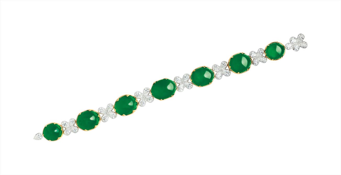 Seven jadeite cabochons, <em>measuring approximately from xxx to xxxmm </em>Diamonds set in-between, totalling approximately 6.65 carats18 karat white and yellow gold附 香港玉石鑑定中心 證書