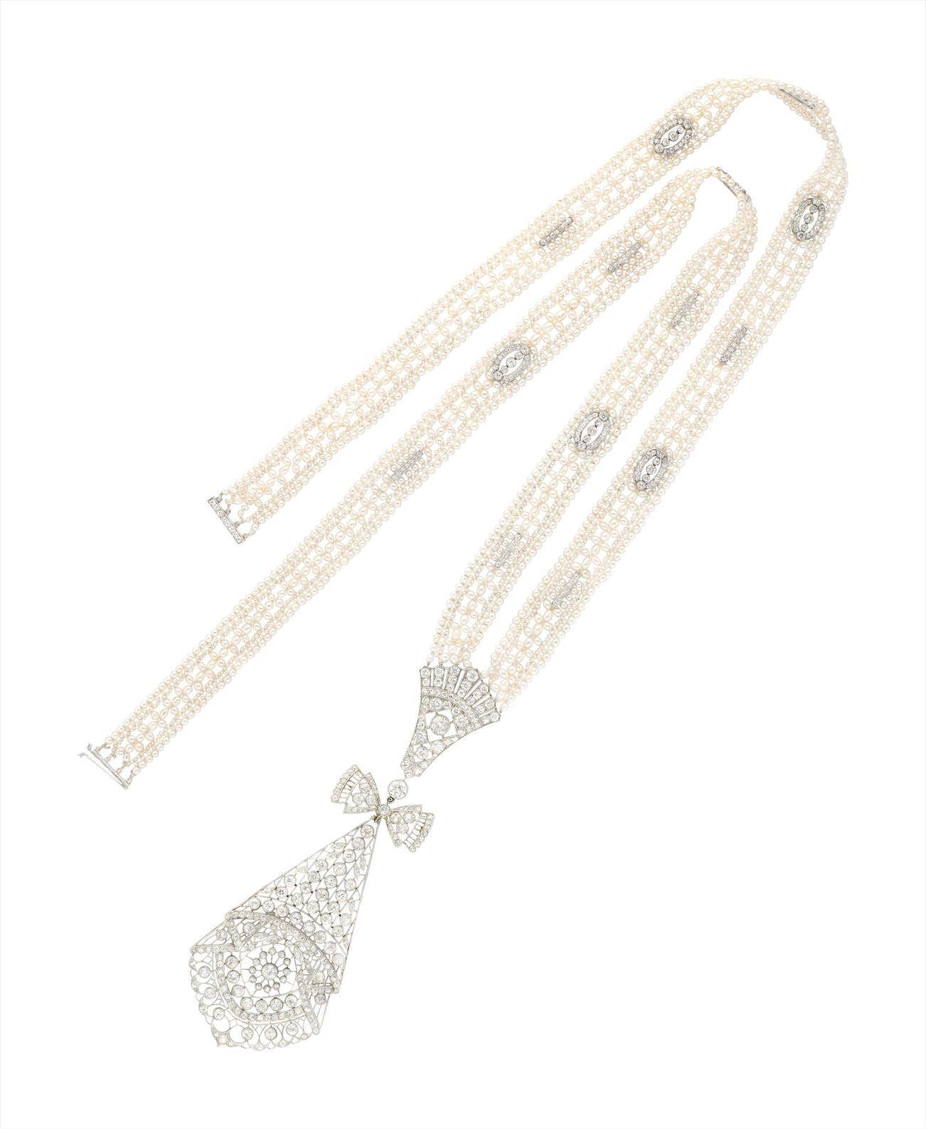 名為Sautoir的長項鏈是愛德華和美好時代十分流行的珠寶款式,當中最珍貴的造型會以小珍珠編織成網狀項鏈,再配以鑲有鑽石的吊墜或流蘇,金工精緻,並多採用種子式的細膩鑲嵌手法。這些吊墜的題材主要受到當時 自然主義的影響,常見有緞帶、蝴蝶結及花朵的造型。 這件拍品是極少能保持原狀而流傳至今的Sautoir項鏈,而且品相良好。許多古董珠寶都逃不過被拆散的命運,被改裝成手鏈或短項鏈,此項鏈卻能保存至今,實在可幸。拍品還附有原裝為其度身訂造的盒子,更加難能可貴。