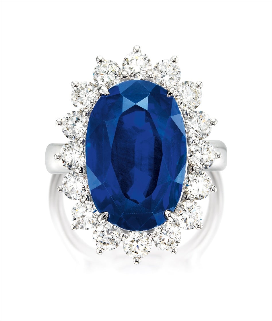 One oval sapphire, 14.48 caratsSixteen brilliant-cut diamonds in the surround, totalling 1.45 carats18 karat white gold附 瑞士Gübelin 及 美國GIA 證書