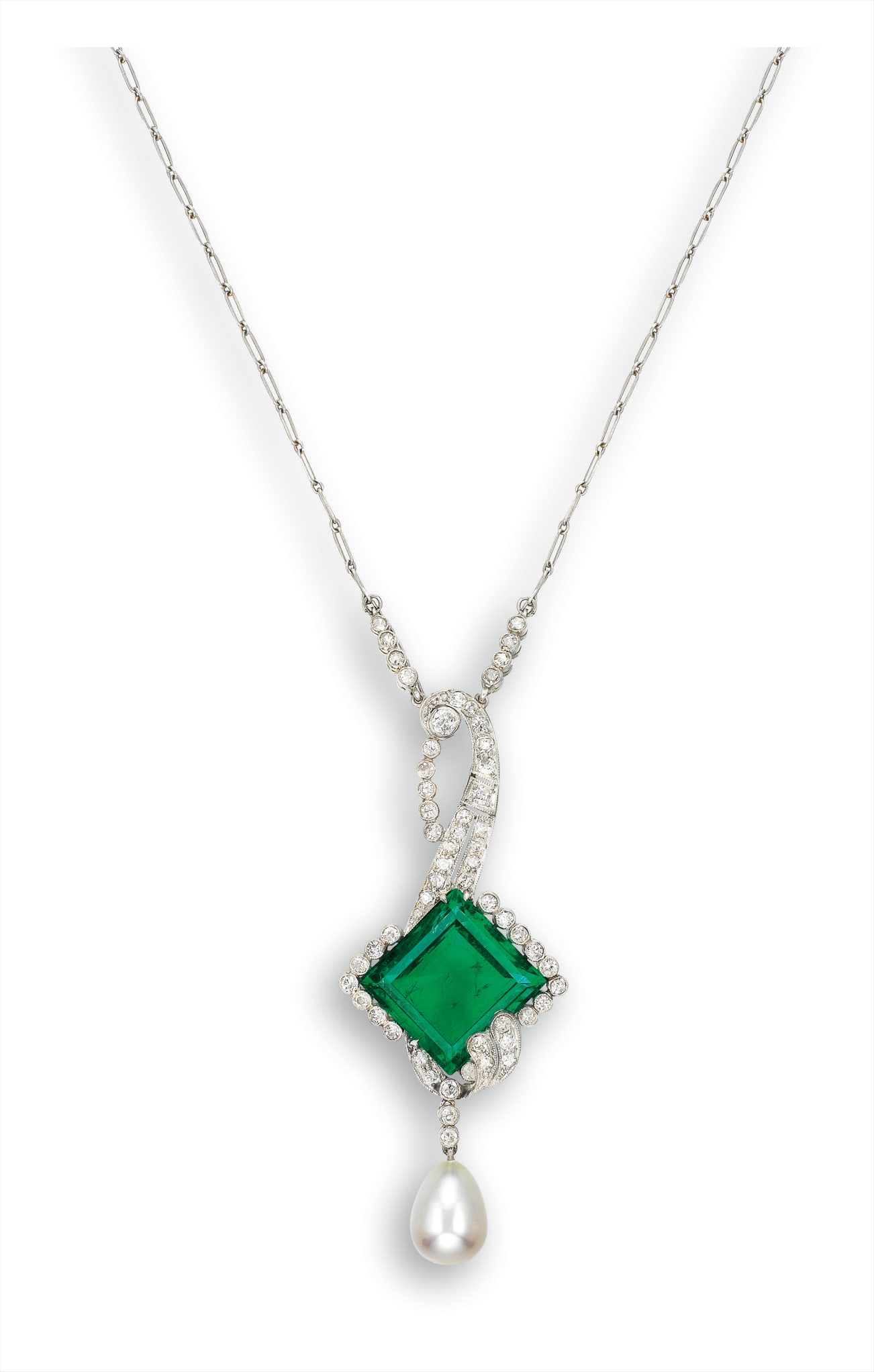 Art Deco「哥倫比亞」袓母綠 配 天然海水珍珠 及 鑽石吊墜項鏈, 約1920年, 袓母綠約重10.00克拉