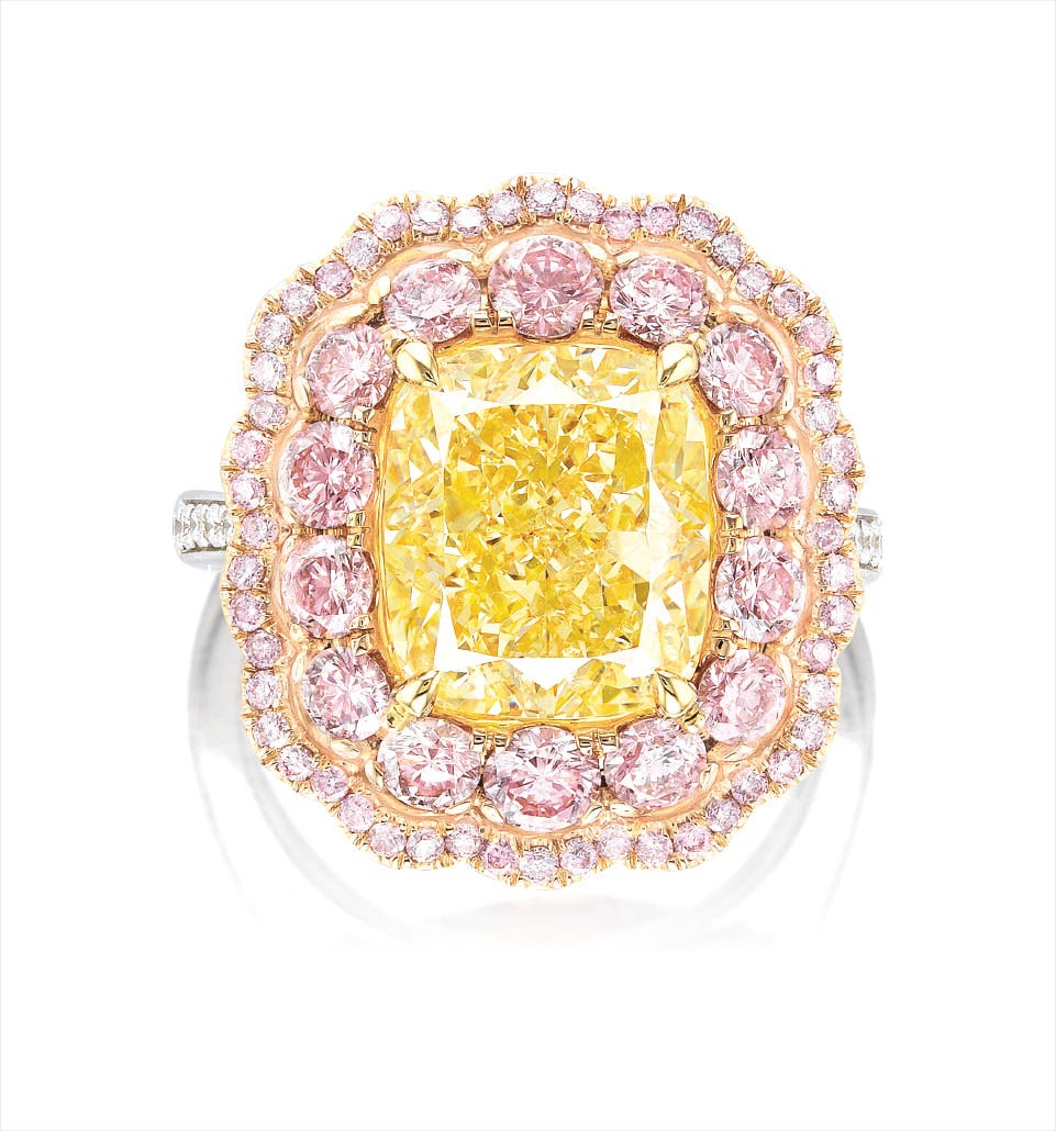 5.87克拉 無瑕 (極優打磨拋光及比例) 彩黃色鑽石 配 粉紅鑽及鑽石戒指