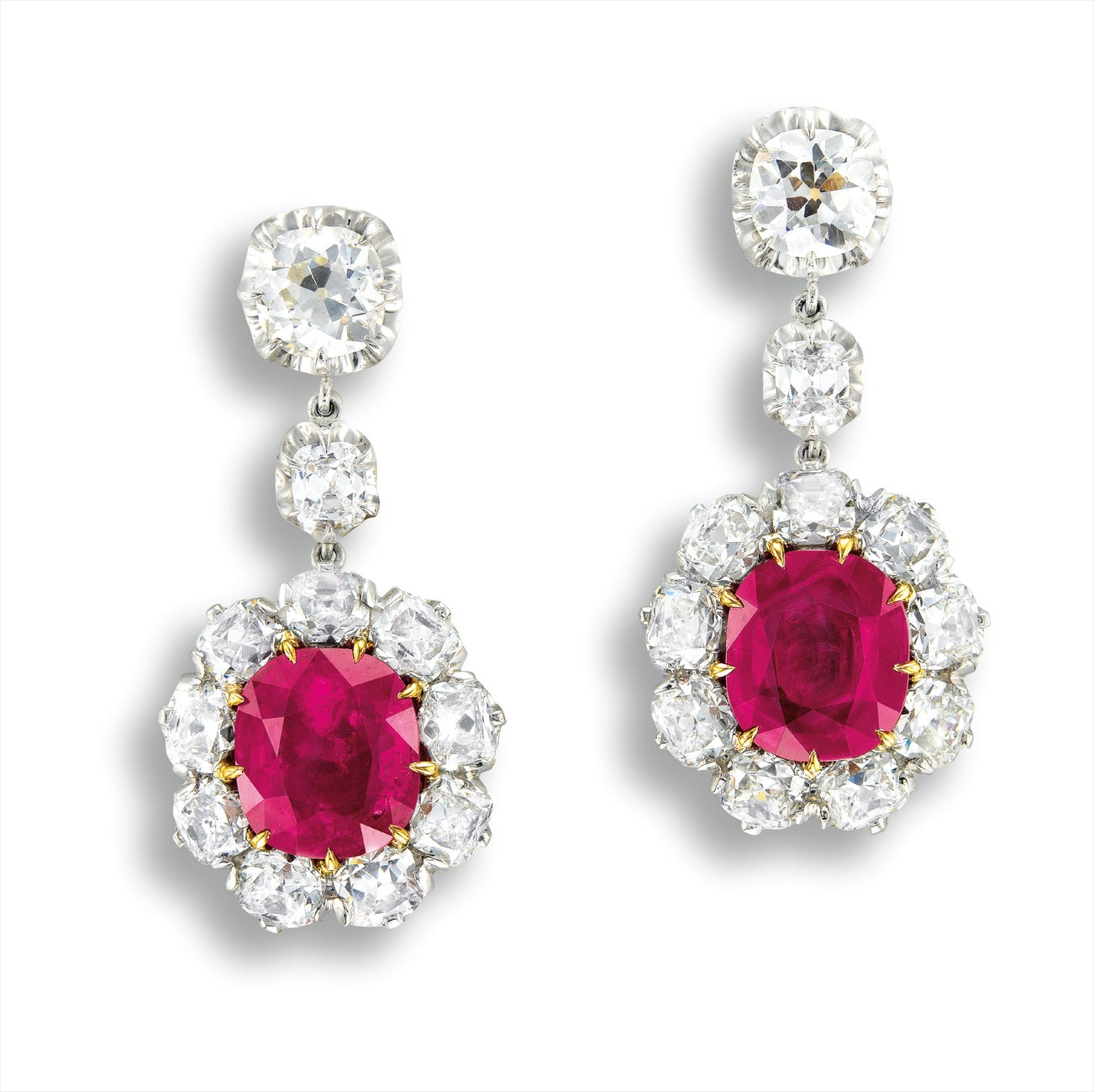 Two cushion-shaped rubies, approximately 5.40 and 4.60 caratsCushion-shaped diamonds in the surround and surmount, totalling approximately 10.00 caratsPlatinum and 18 karat yellow gold附 瑞士SSEF 證書