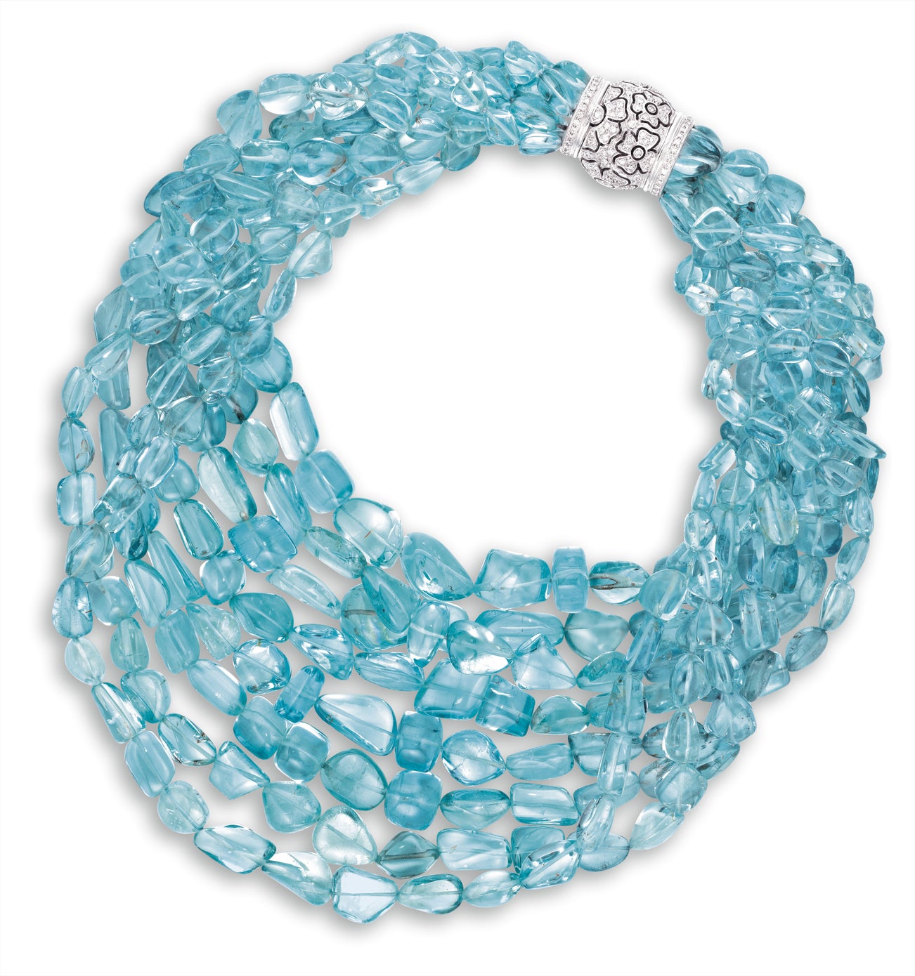 Over three hundred tumbled aquamarine beads on eight strandsDiamond-set openwork clasp, diamonds totalling approximately 1.25 carats18 karat white goldItalian assay mark and hallmarkGross weight approximately 378 grams