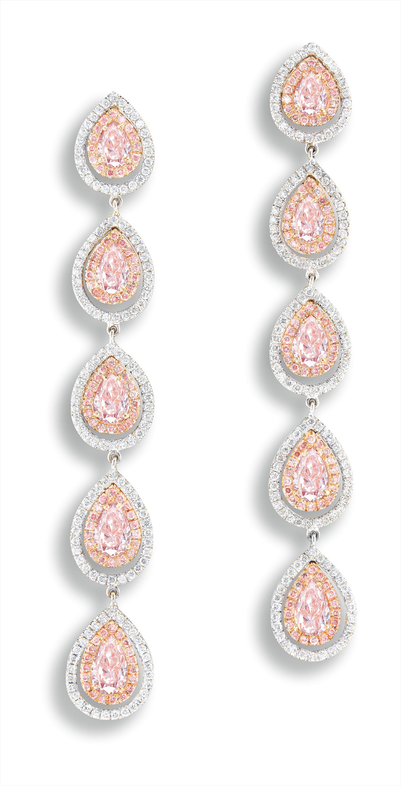 粉紅色鑽石配鑽石吊耳環一對, 粉紅色鑽石共重5.11克拉