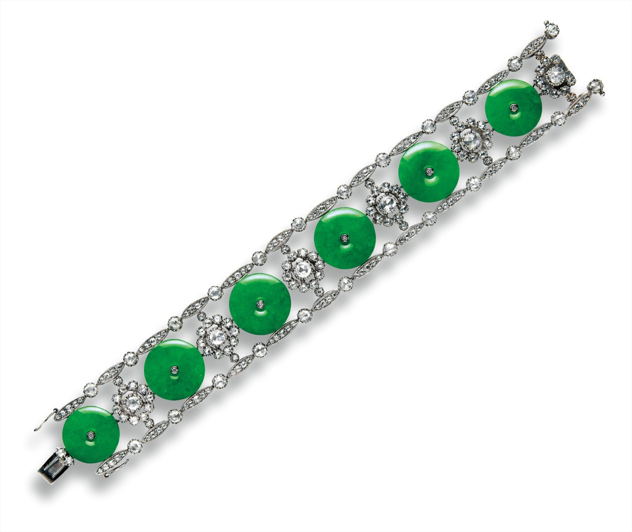 Six jadeite <em>huaigu</em>, <em>diameter measuring approximately 15.93 to 14.61mm, thickness approximately 1.75 to 1.43mm</em>Rose- and brilliant-cut diamonds set on links, totalling approximately 6.40 carats18 karat blackened gold附 香港玉石鑑定中心 證書