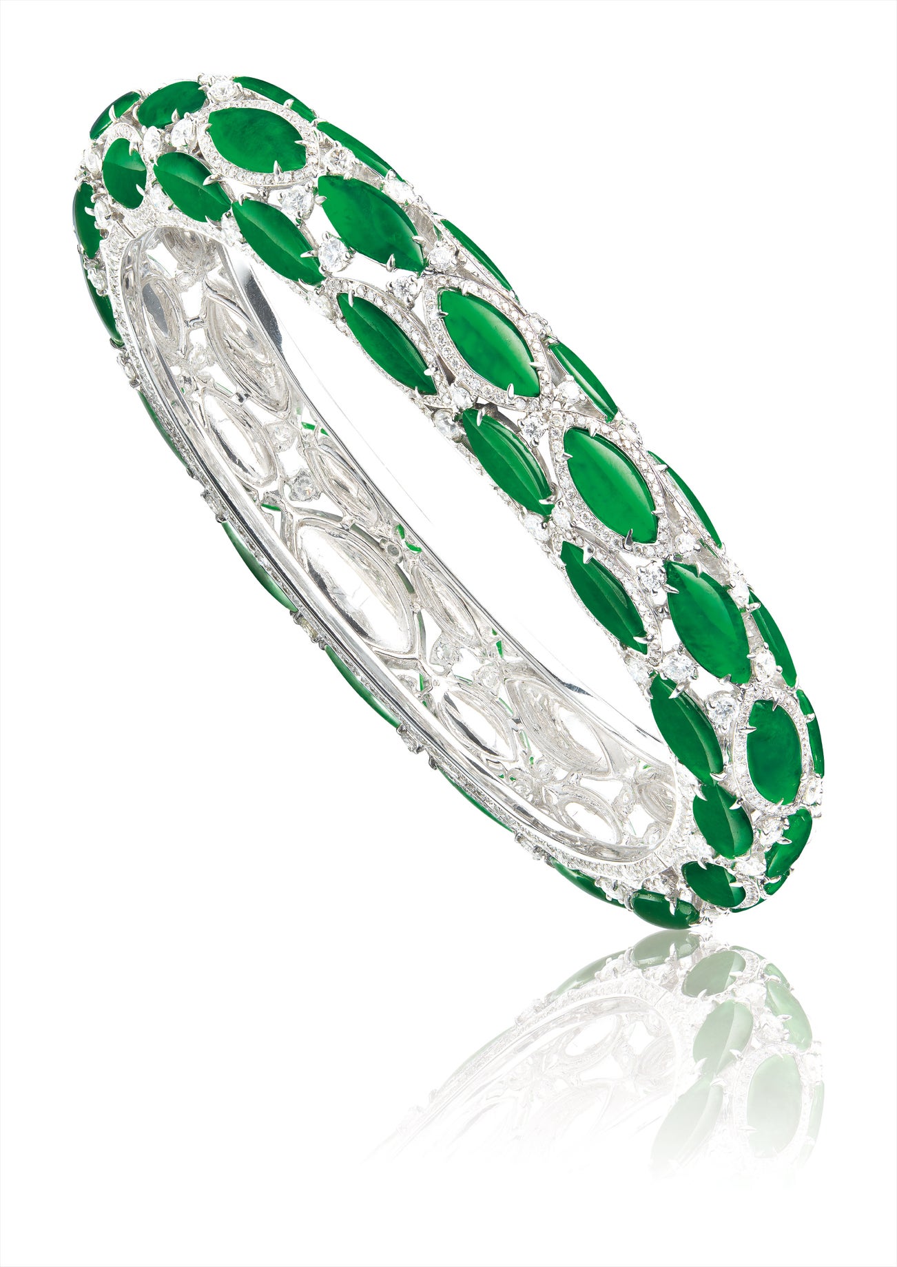 Fifty-one marquise-shaped jadeite cabochons,<em> measuring approximately 13.10 x 5.97 x 1.11mm to 8.83 x 4.95 x 0.90mm</em>Brilliant-cut diamonds totalling approximately 4.10 carats18 karat white gold附 香港玉石鑑定中心 證書