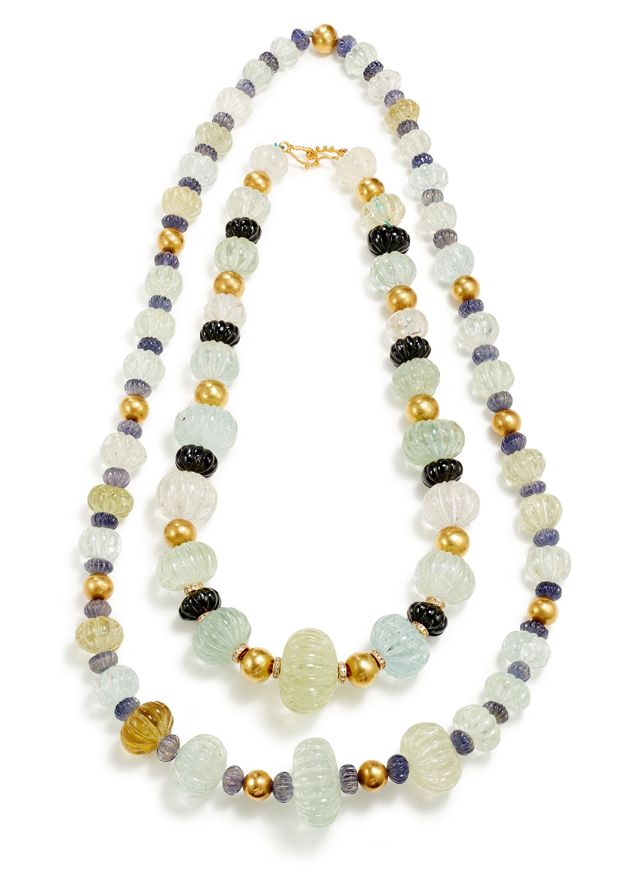 A Set of Carved Beryl, Spinel, Iolite, Diamond and Gold Bead Necklaces
