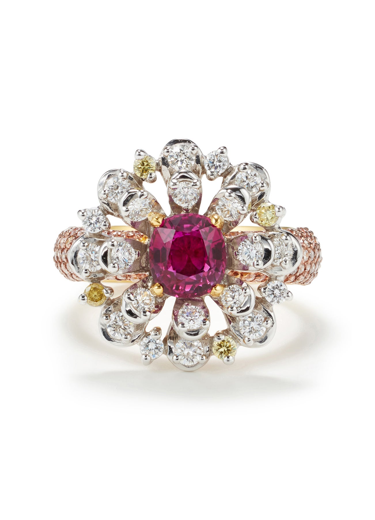 A Ruby, Diamond, Colored Diamond and Gold Ring
