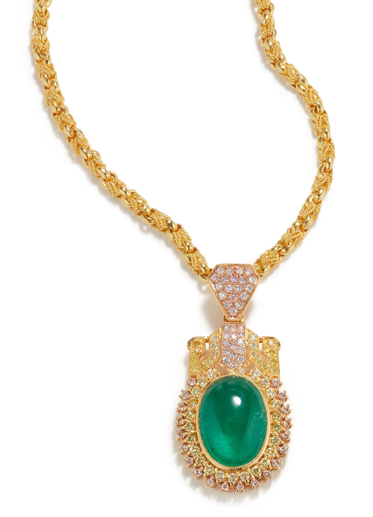 An Emerald, Colored Diamond and Gold Pendant Necklace