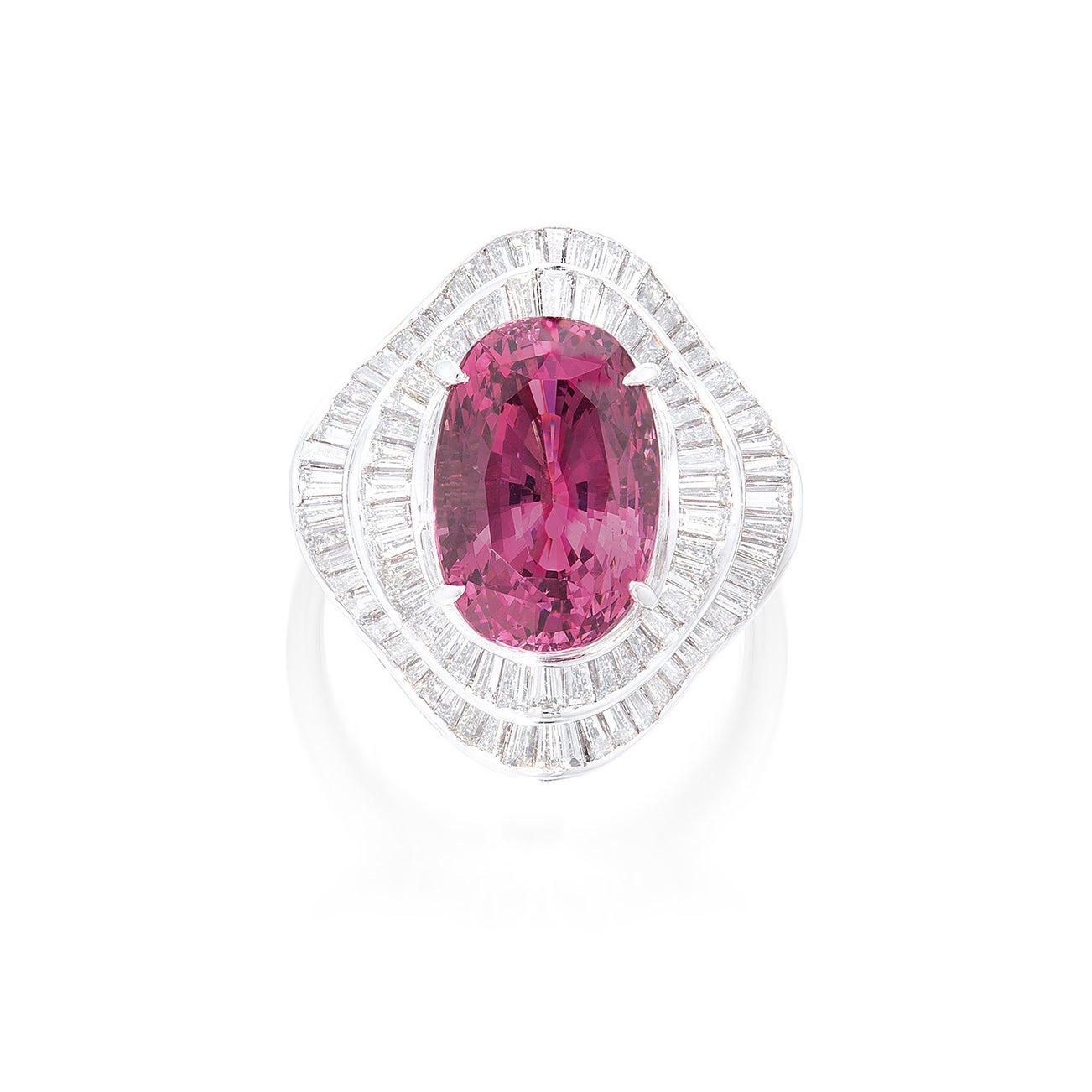 One cushion-shaped pink spinel, 7.14 caratsTapered baguette-cut diamond surroundPlatinum附瑞士GRS證書