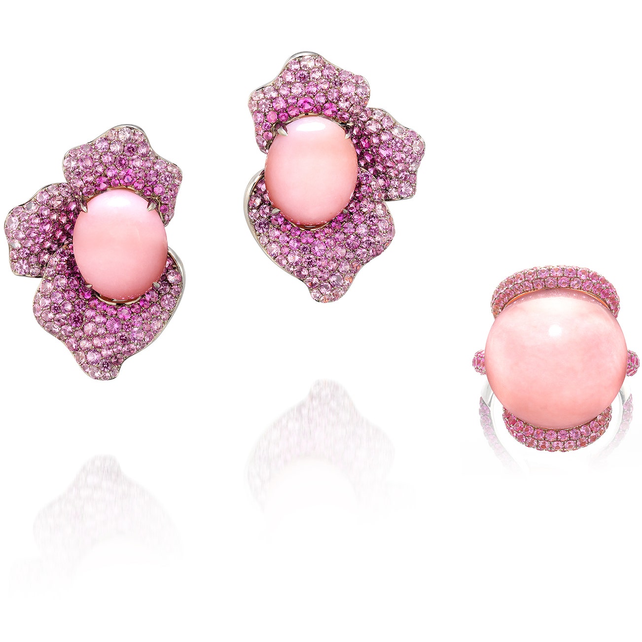 Comprising a ring, set with a pink opal bead measuring approximately 17.99 x 18.32 mm, within a pink sapphire surround and a pair of earrings, mounted in oxidized white gold, post and butterfly fittings, ring size 8.