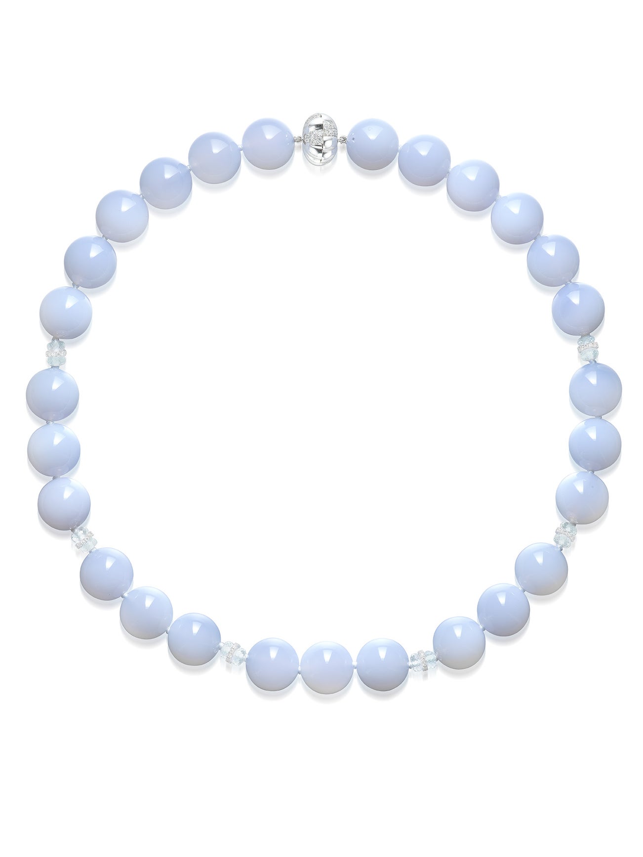 Composed of twenty-seven chalcedony beads, accented by topaz beads and diamond-set spacers,