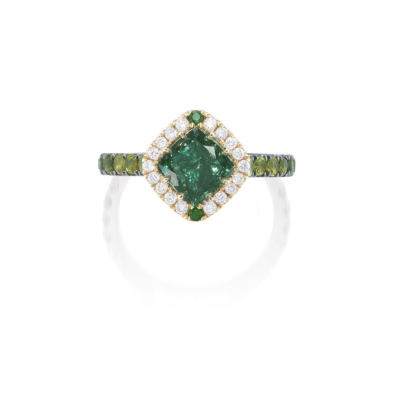Set with a cushion-shaped fancy deep grayish green diamond weighing approximately 1.88 carats, within a brilliant-cut and circular-cut diamond of green tint surround, the mount set with brilliant-cut diamond of green tint, mounted in oxidized white gold and gold, size 6¼