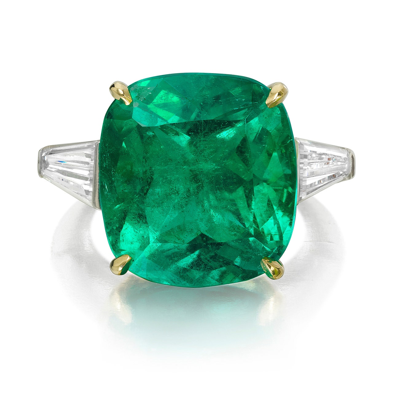 Set with a cushion shaped emerald weighing 15.19 carats, between tapered baguette diamond shoulders, mounted in 18k white and yellow gold, size 6.75.