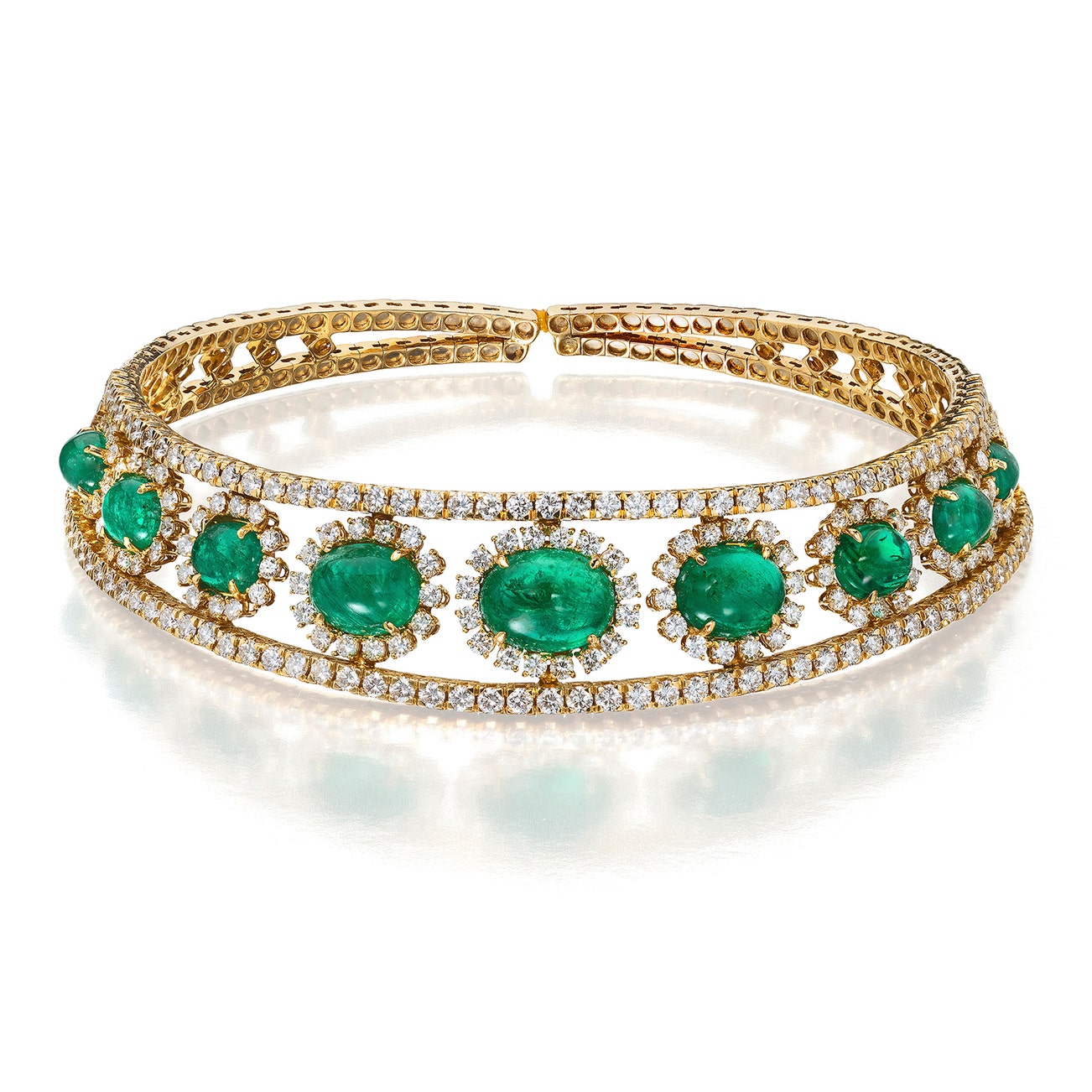 Designed as a line of graduated oval cabochon emeralds, within a frame of brilliant-cut diamonds, between two rows of brilliant-cut diamonds, mounted in 18k gold, inner circumference approximately 12 1/2 to 14 inches, flexible.
